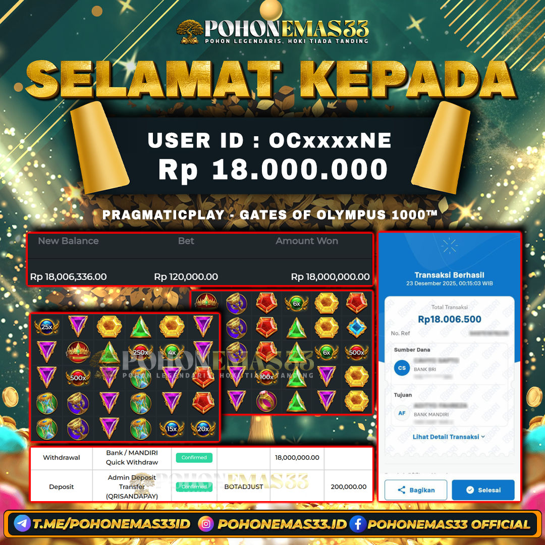 SELAMAT!! Kepada Member setia POHONEMAS33 telah berhasil menang besar di SLOT PRAGMATIC PLAY GATES OF OLYMPUS 1000™ dengan USER ID : OCxxxxNE