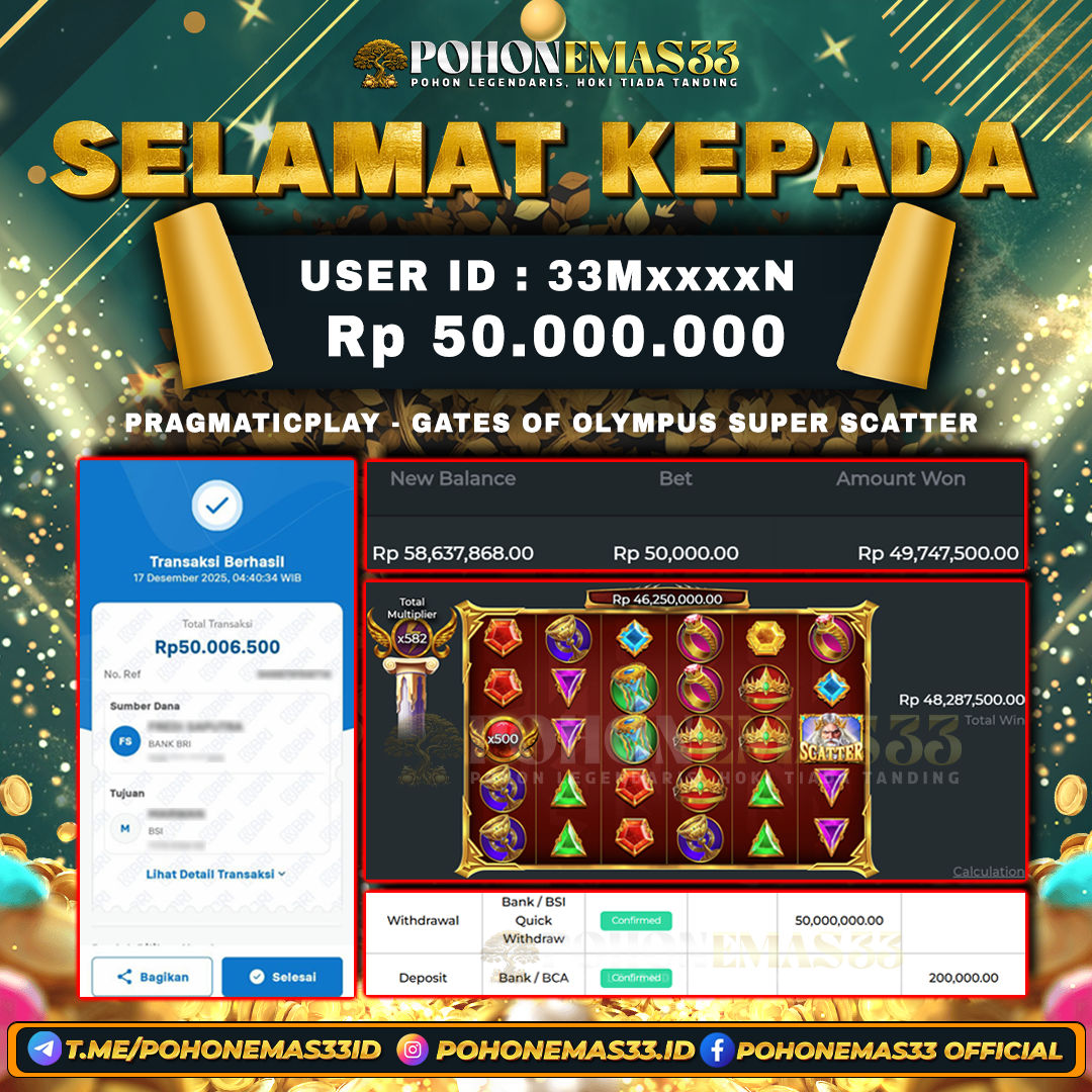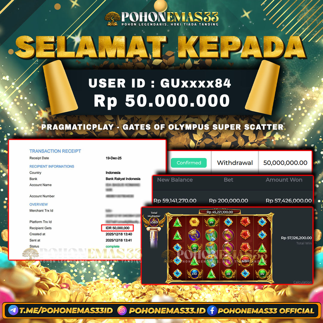 SELAMAT!! Kepada Member setia POHONEMAS33 telah berhasil menang besar di SLOT PRAGMATIC PLAY - GATES OF OLYMPUS SUPER SCATTER dengan USER ID : 33MxxxN