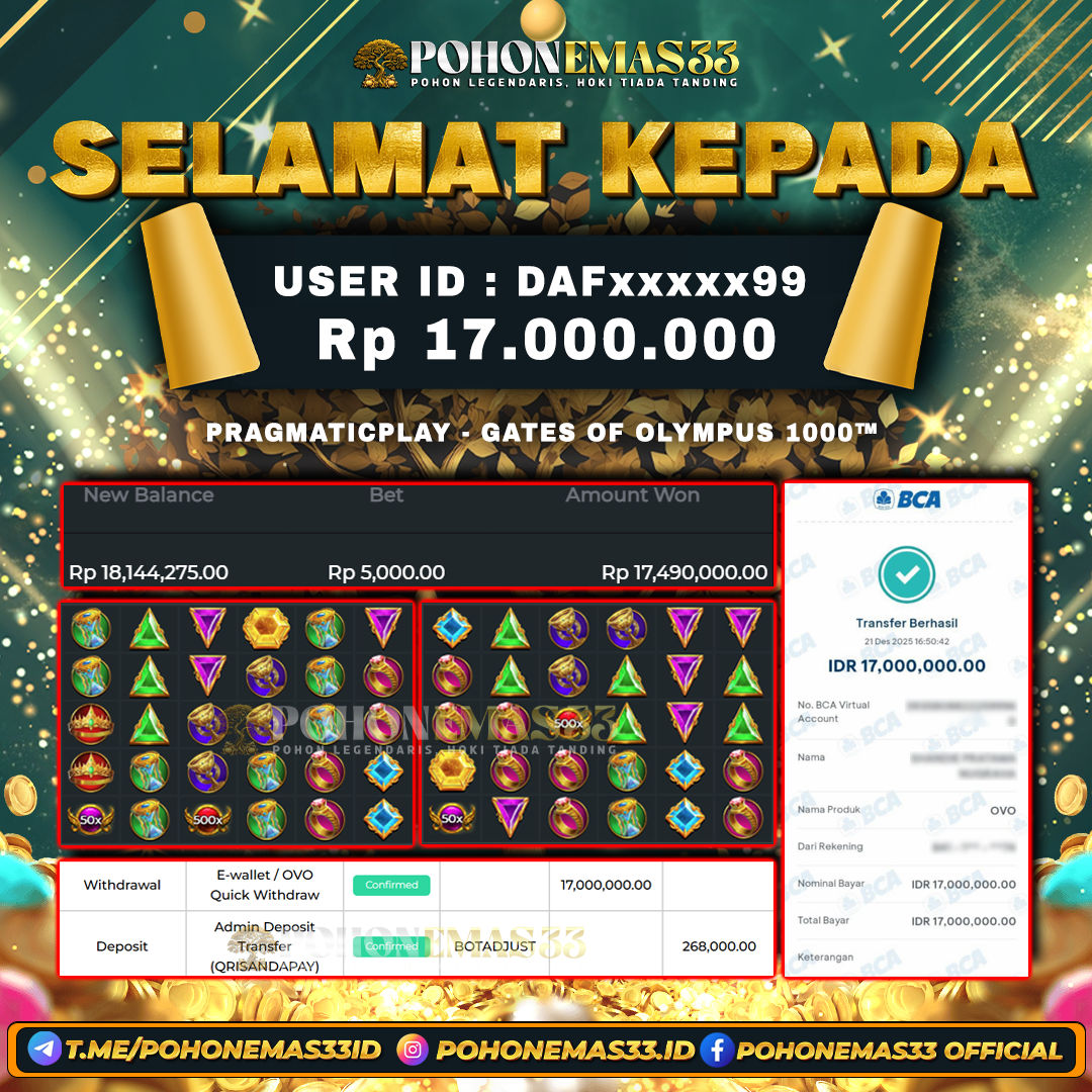 SELAMAT!! Kepada Member setia POHONEMAS33 telah berhasil menang besar di SLOT PRAGMATIC PLAY GATES OF OLYMPUS 1000™ dengan USER ID : DAFxxxxx99