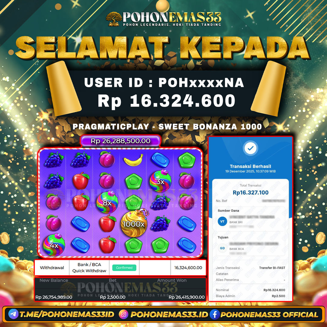 SELAMAT!! Kepada Member setia POHONEMAS33 telah berhasil menang besar di SLOT PRAGMATIC PLAY SWEET BONANZA 1000 dengan USER ID : POHxxxxNA