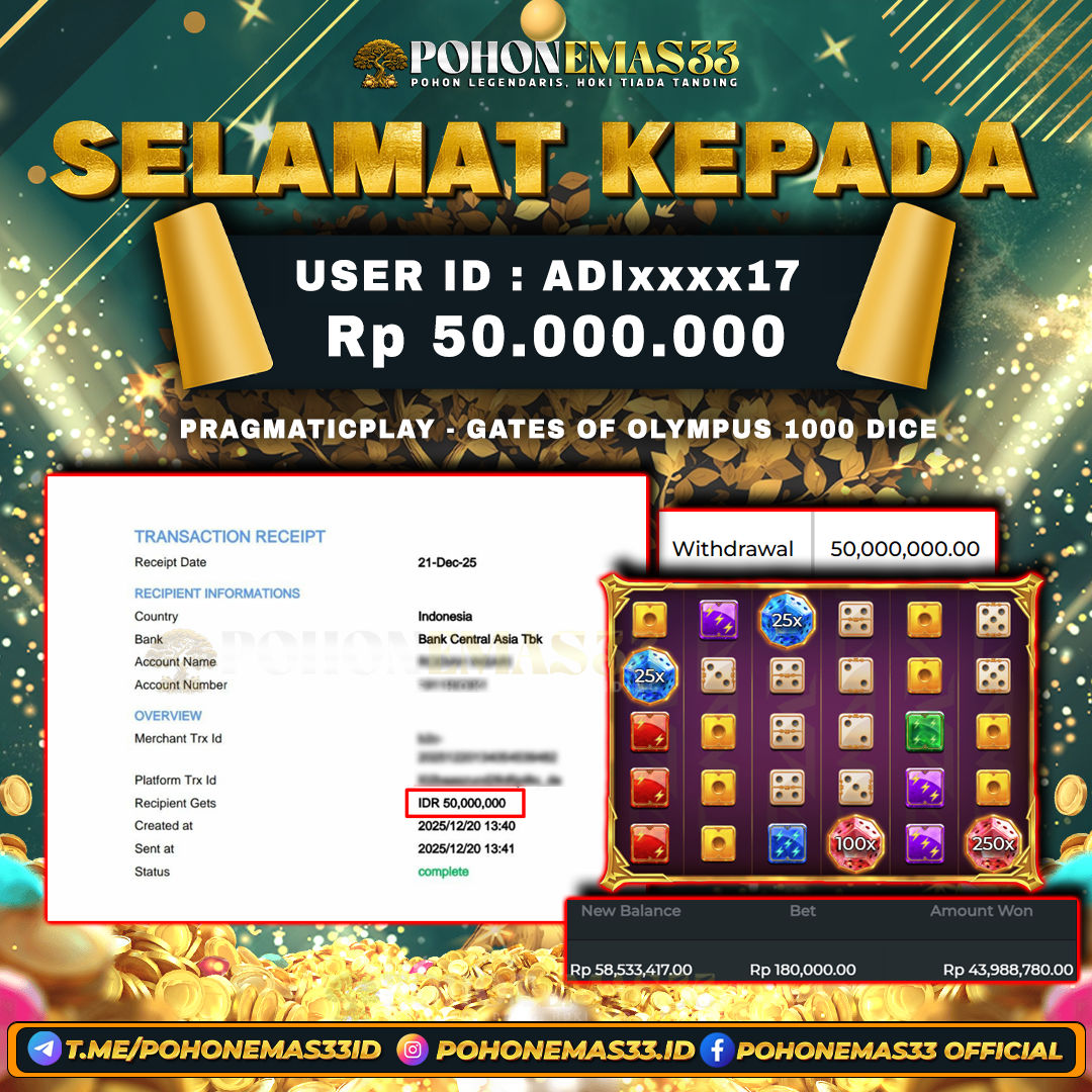 SELAMAT!! Kepada Member setia POHONEMAS33 telah berhasil menang besar di SLOT PRAGMATIC PLAY GATES OF OLYMPUS 1000 DICE dengan USER ID : ADIxxxx17