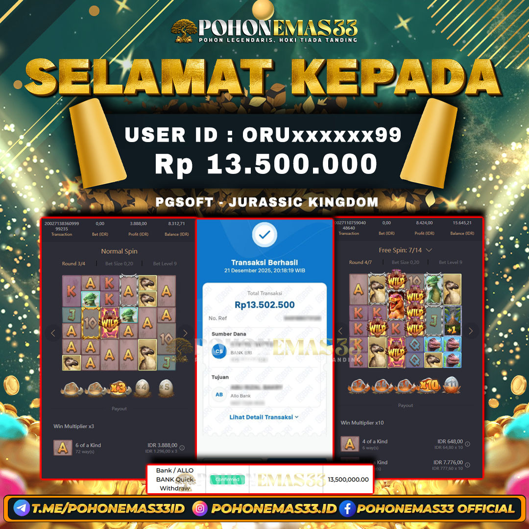 SELAMAT!! Kepada Member setia POHONEMAS33 telah berhasil menang besar di SLOT PGSOFT JURASSIC KINGDOM dengan USER ID : ORUxxxxxx99