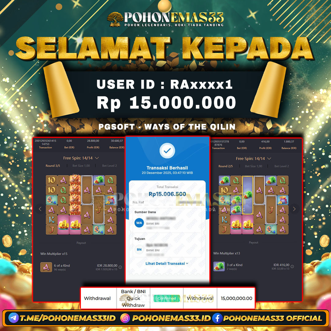 SELAMAT!! Kepada Member setia POHONEMAS33 telah berhasil menang besar di SLOT PGSOFT WAYS OF THE QILIN dengan USER ID : RAxxxx1