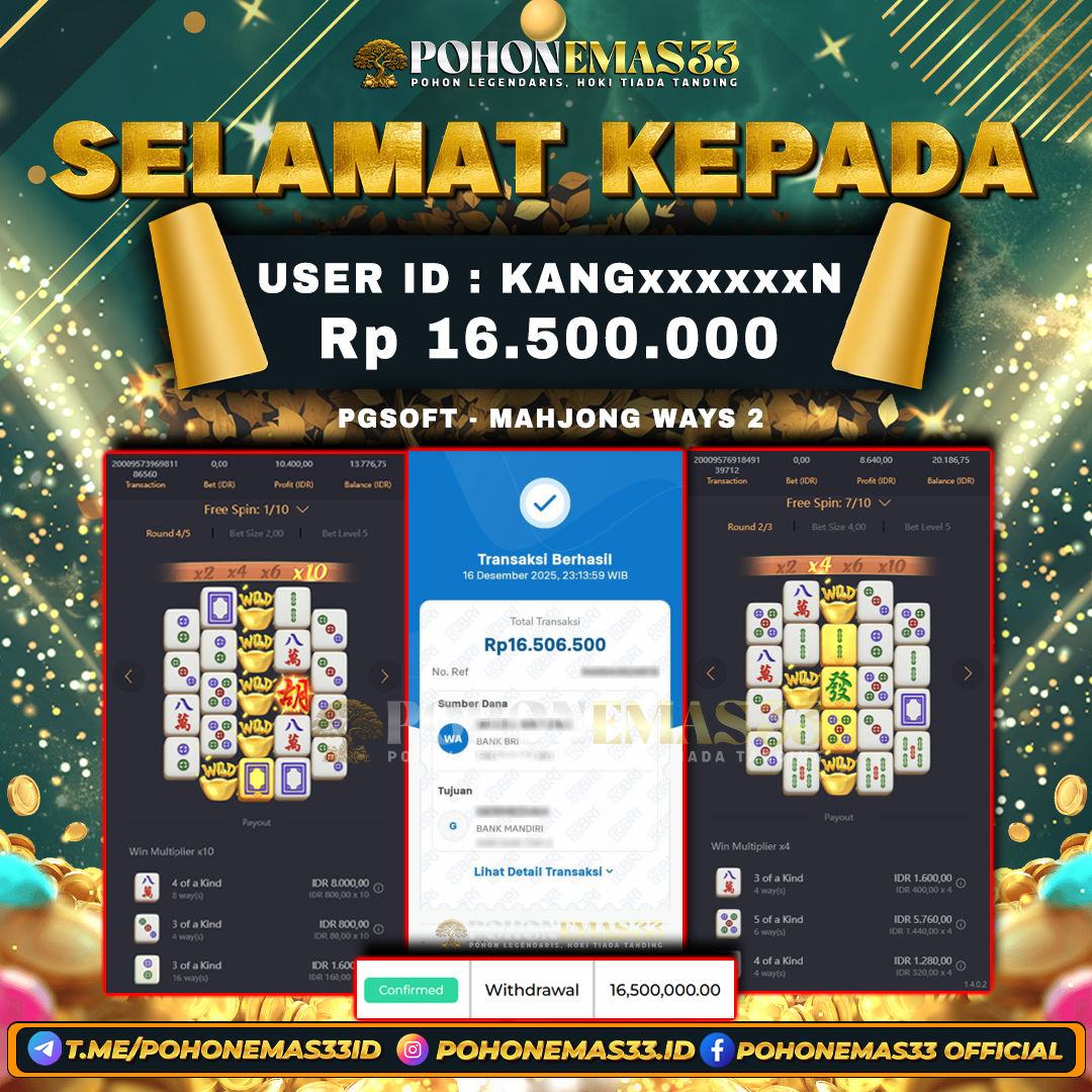 SELAMAT!! Kepada Member setia POHONEMAS33 telah berhasil menang besar di SLOT PG SOFT - MAHJONG WAYS 2 dengan USER ID : KANGxxxxxN