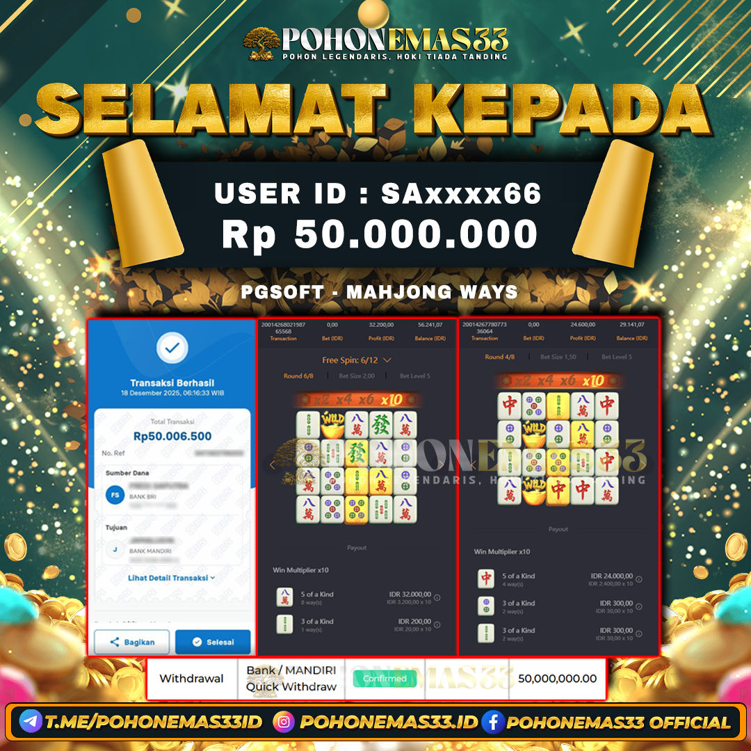 SELAMAT!! Kepada Member setia POHONEMAS33 telah berhasil menang besar di SLOT PGSOFT MAHJONG WAYS dengan USER ID : SAxxxx66