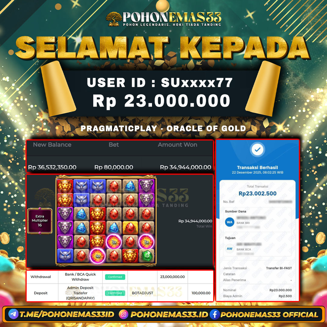 SELAMAT!! Kepada Member setia POHONEMAS33 telah berhasil menang besar di SLOT PRAGMATIC PLAY ORACLE OF GOLD dengan USER ID : SUxxxx77