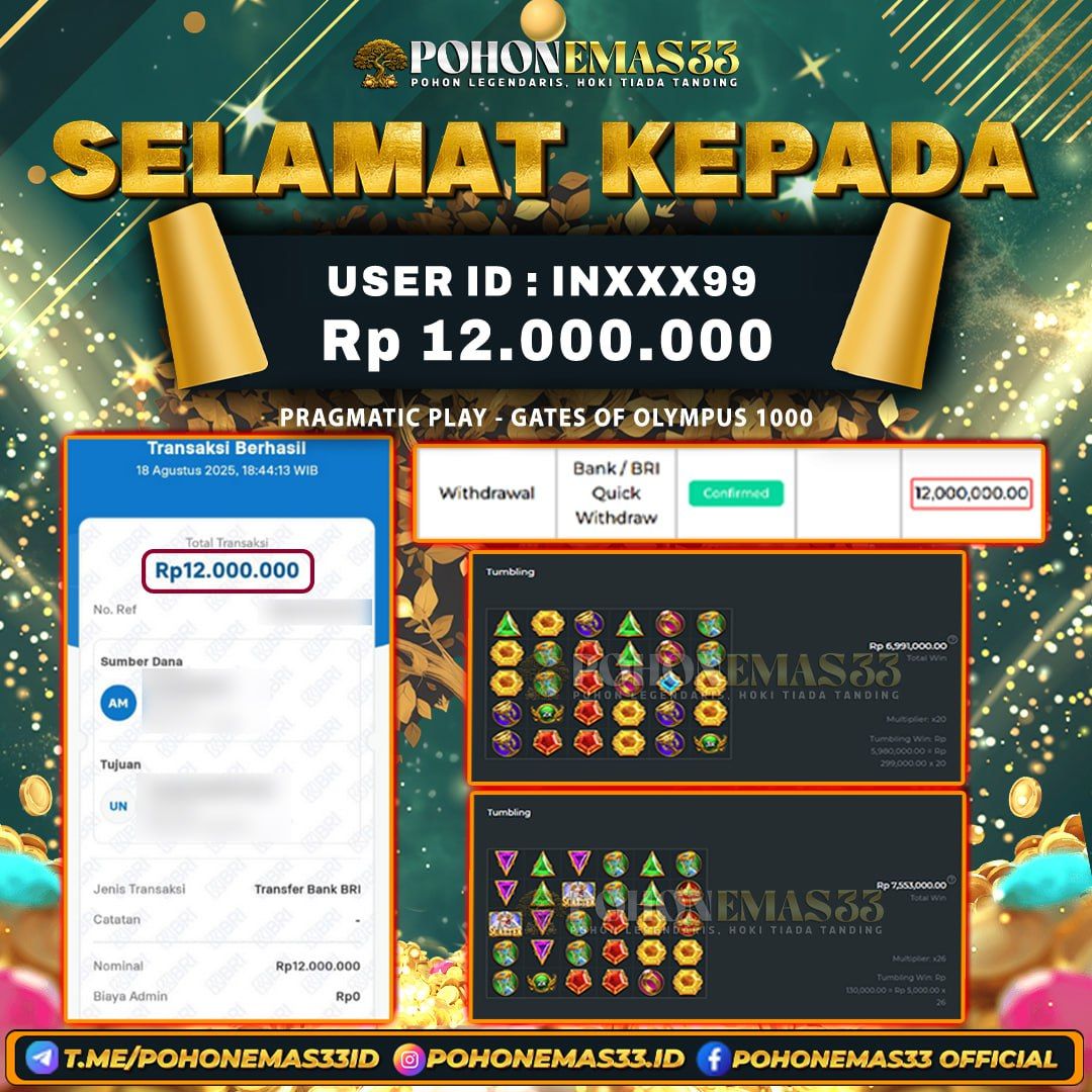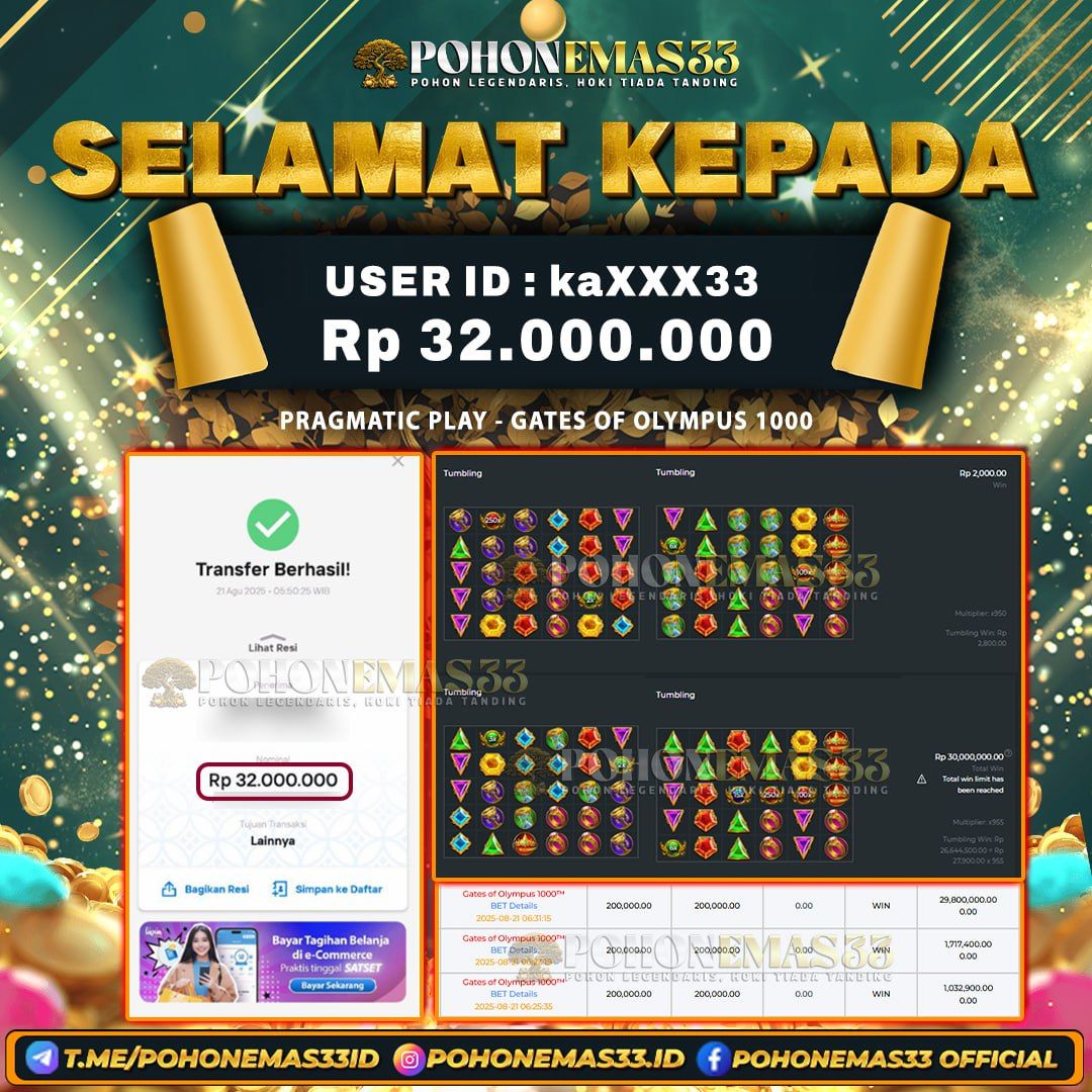 Selamat Kepada Member setia POHONEMAS33 yang berhasil memenangkan taruhan di PRAGMATIC PLAY - GATES OF OLYMPUS 1000 dengan USER ID : kaXXX33
