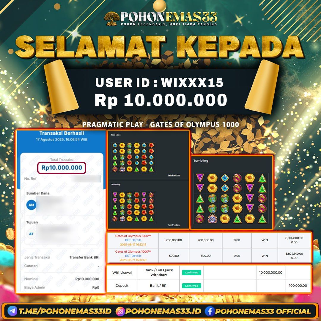 SELAMAT!! Kepada Member setia POHONEMAS33 telah berhasil menang besar di SLOT PRAGMATIC PLAY - GATES OF OLYMPUS 1000 dengan USER ID : WIXXX15