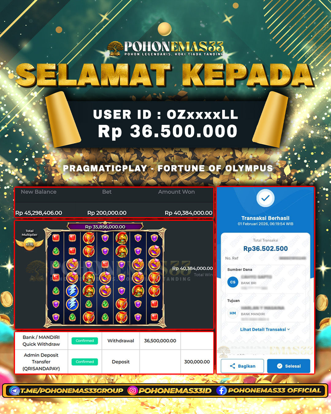 SELAMAT!! Kepada Member setia POHONEMAS33 telah berhasil menang besar di SLOT PRAGMATIC PLAY FORTUNE OF OLYMPUS dengan USER ID : OZxxxxLL