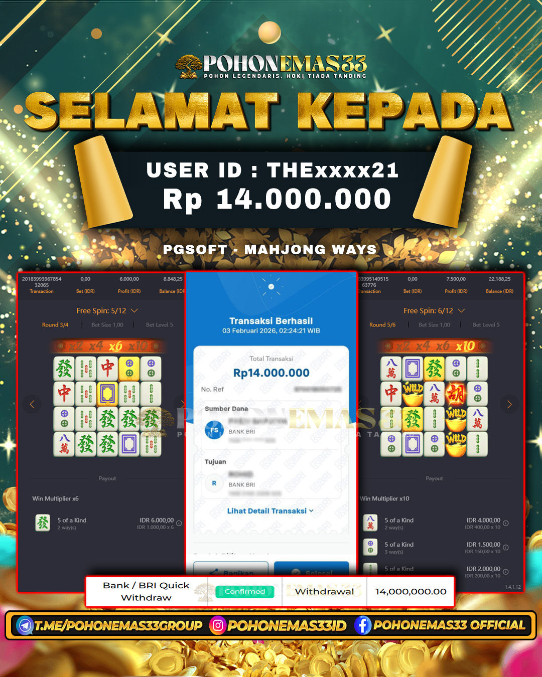 SELAMAT!! Kepada Member setia POHONEMAS33 telah berhasil menang besar di SLOT PGSOFT MAHJONG WAYS dengan USER ID : THExxxx21