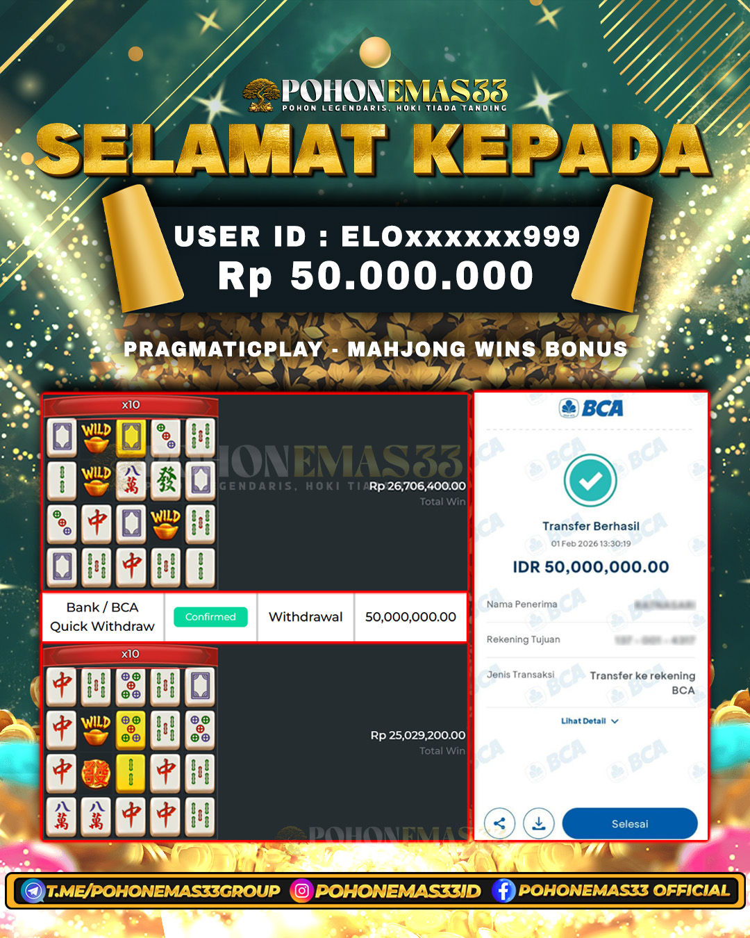 SELAMAT!! Kepada Member setia POHONEMAS33 telah berhasil menang besar di SLOT PRAGMATIC PLAY MAHJONG WINS BONUS dengan USER ID : ELOxxxxxx999