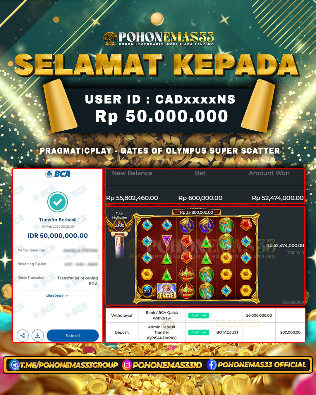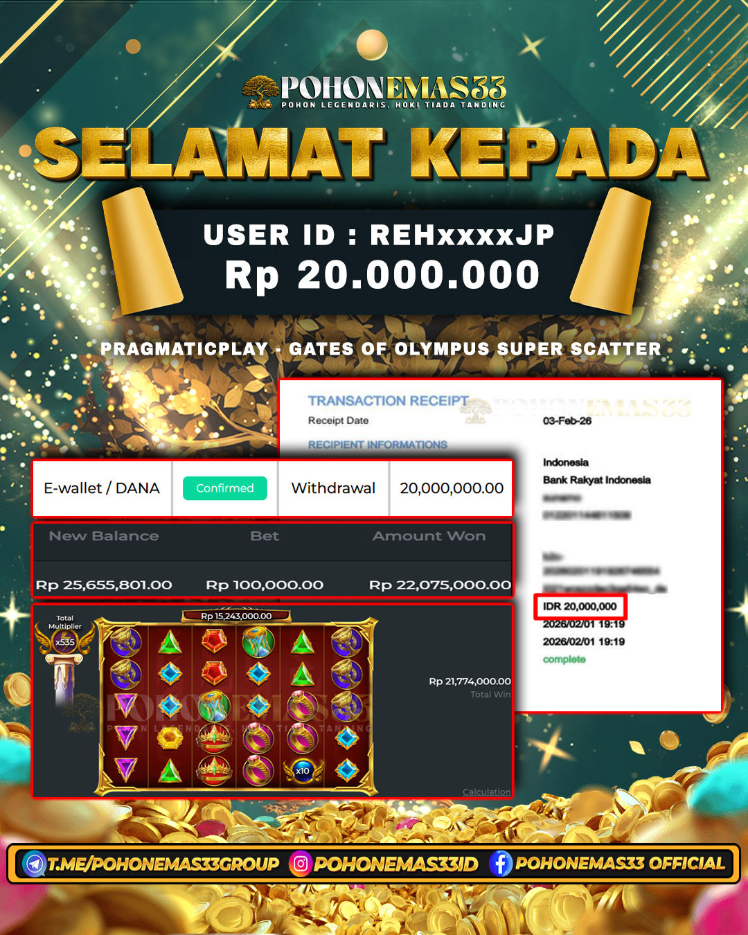 SELAMAT!! Kepada Member setia POHONEMAS33 telah berhasil menang besar di SLOT PRAGMATIC PLAY GATES OF OLYMPUS SUPER SCATTER dengan USER ID : REHxxxxJP