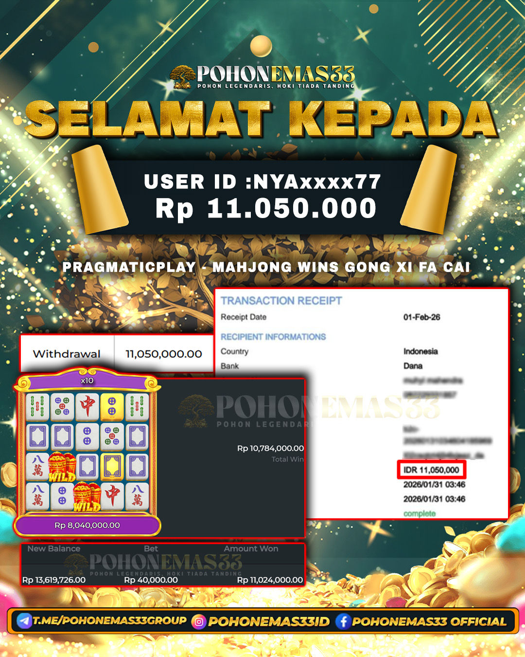 SELAMAT!! Kepada Member setia POHONEMAS33 telah berhasil menang besar di SLOT PRAGMATIC PLAY MAHJONG WINS GONG XI FA CAI dengan USER ID : NYAxxxx77