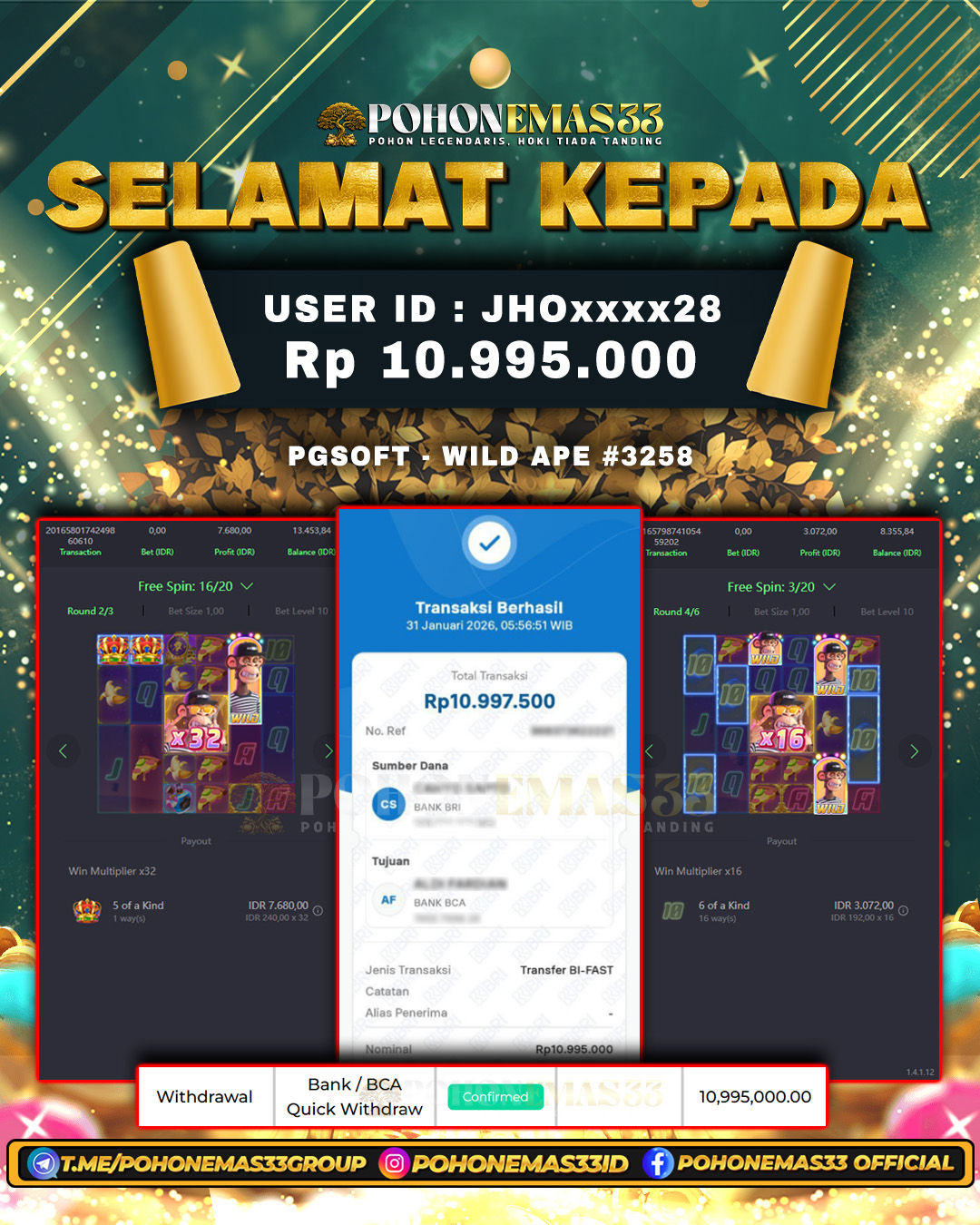 SELAMAT!! Kepada Member setia POHONEMAS33 telah berhasil menang besar di SLOT PGSOFT WILD APE #3258 dengan USER ID : JHOxxxx28