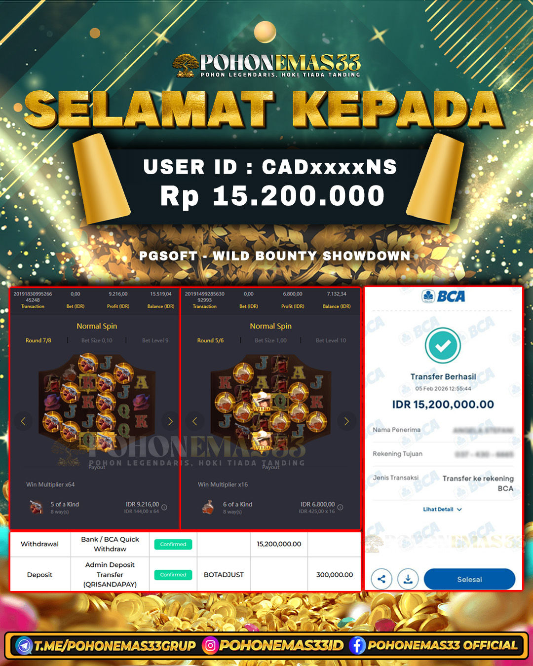 SELAMAT!! Kepada Member setia POHONEMAS33 telah berhasil menang besar di SLOT PGSOFT WILD BOUNTY SHOWDOWN dengan USER ID : CADxxxxNS