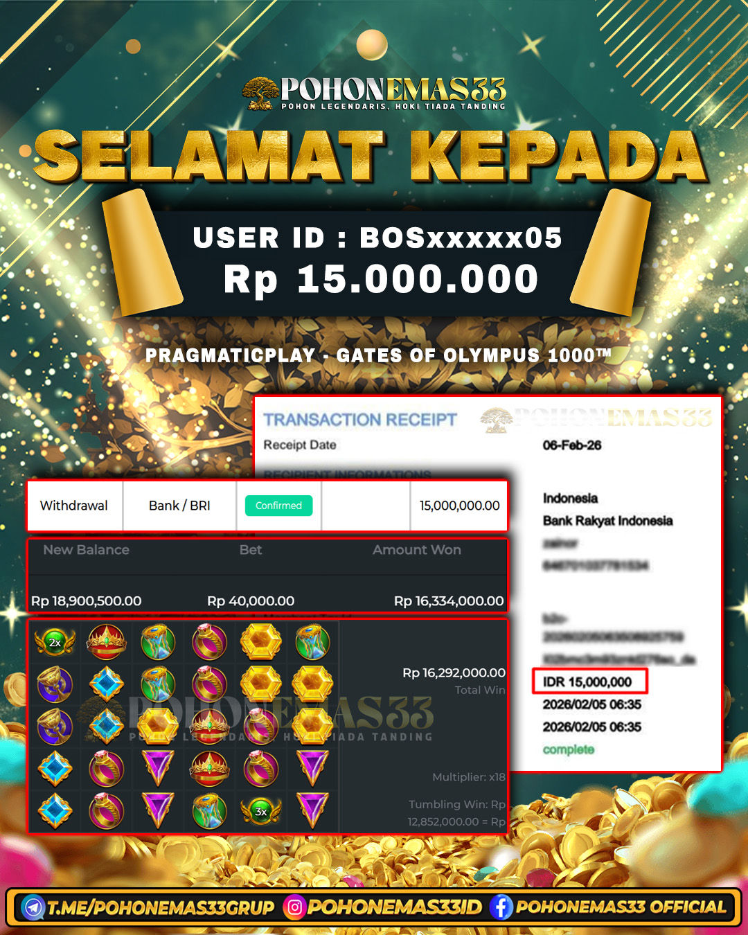 SELAMAT!! Kepada Member setia POHONEMAS33 telah berhasil menang besar di SLOT PRAGMATIC PLAY GATES OF OLYMPUS 1000™ dengan USER ID : BOSxxxxx05