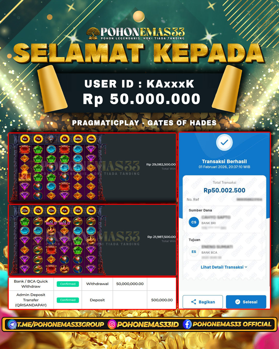 SELAMAT!! Kepada Member setia POHONEMAS33 telah berhasil menang besar di SLOT PRAGMATIC PLAY GATES OF HADES dengan USER ID : KAxxxK