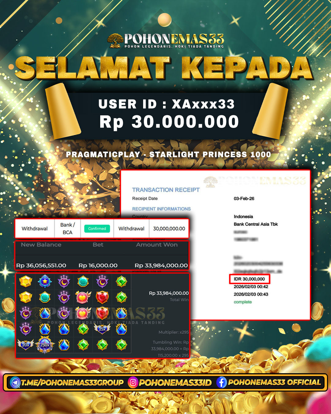 SELAMAT!! Kepada Member setia POHONEMAS33 telah berhasil menang besar di SLOT PRAGMATIC PLAY STARLIGHT PRINCESS 1000 dengan USER ID : XAxxx33