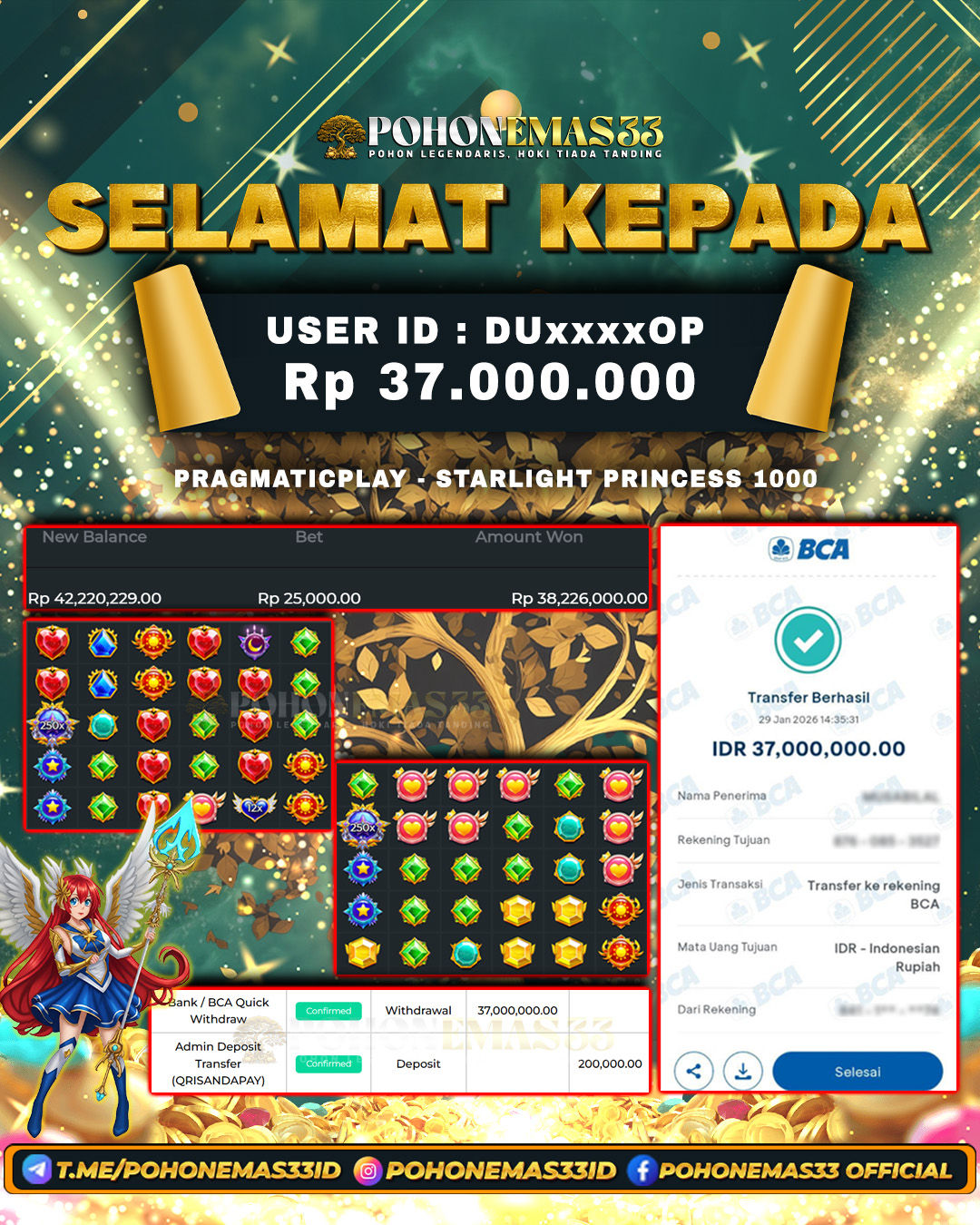 SELAMAT!! Kepada Member setia POHONEMAS33 telah berhasil menang besar di SLOT PRAGMATIC PLAY STARLIGHT PRINCESS 1000 dengan USER ID : DUxxxxOP