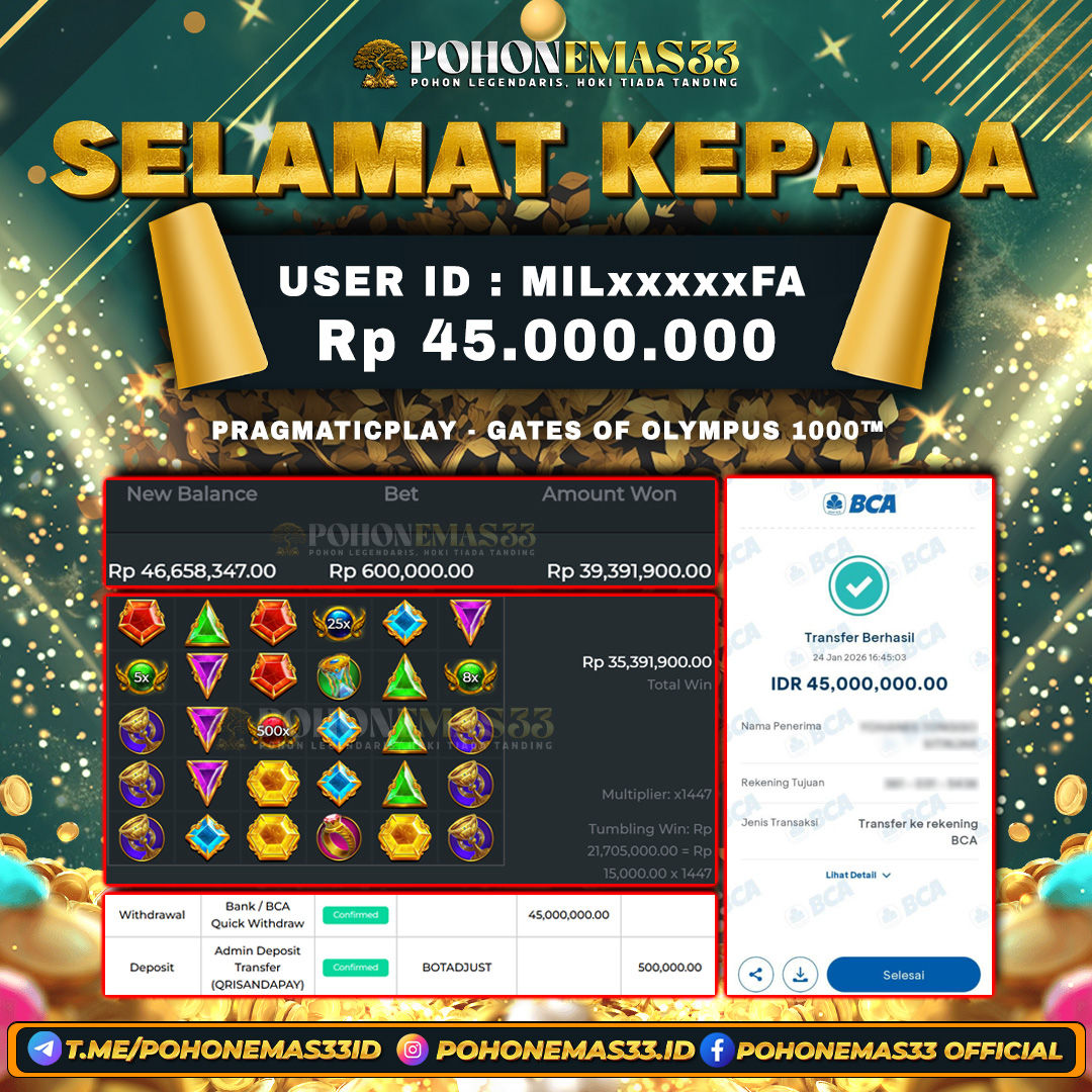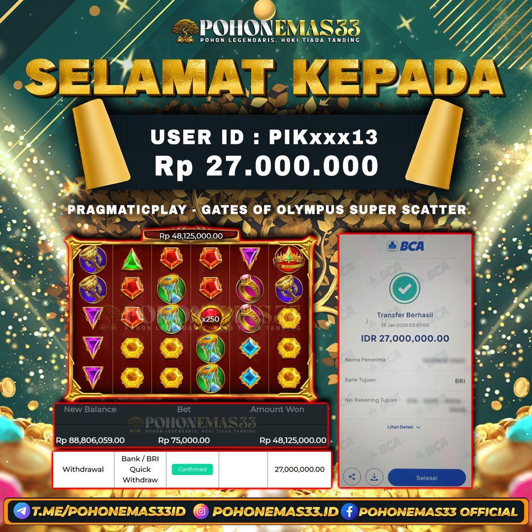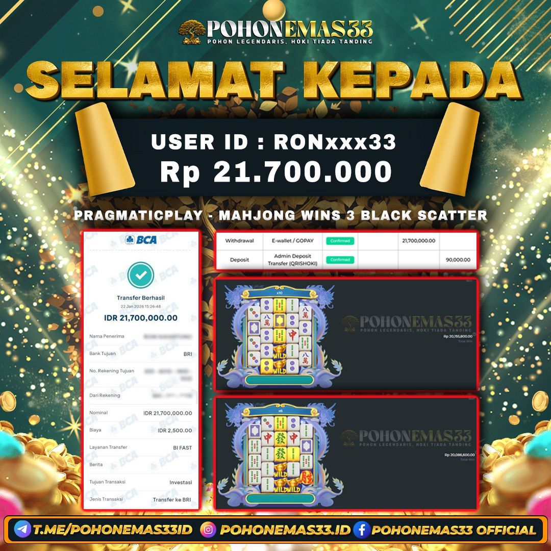 Read MorePOHONEMAS33 merupakan slot online yang membayar semua kemenangan member hingga lunas. Setiap pembayaran pada situs kami dilakukan dengan cara transfer ke rekening tujuan yang sudah di daftarkan pada situs online kami, Pembayaran hanya dapat di proses jika rekening yang di daftarkan telah valid dan dapat di transfer. Semua kemenangan member yang mendapatkan hadiah jackpot terbesar akan kami posting agar semua pemain dapat melihat bandar situs terpercaya POHONEMAS33 ini membayar semua kemenangan member hingga lunas. Setiap postingan yang kami posting akan kami lakukan sensor pada nomor rekening 4 digit dan nama rekening untuk menjaga privasi dan kerahasiaan member. Postingan Jackpot yang kami posting agar member atau pemain yang belum pernah bermain bisa melihat slot online Bukan Kaleng Kaleng Seperti POHONEMAS33 ini, Semua postingan jackpot yang kami posting dapat di lihat data keasliannya melalui nomor reff yang di tunjukan pada bank atau mbanking saat kita melakukan transfer.