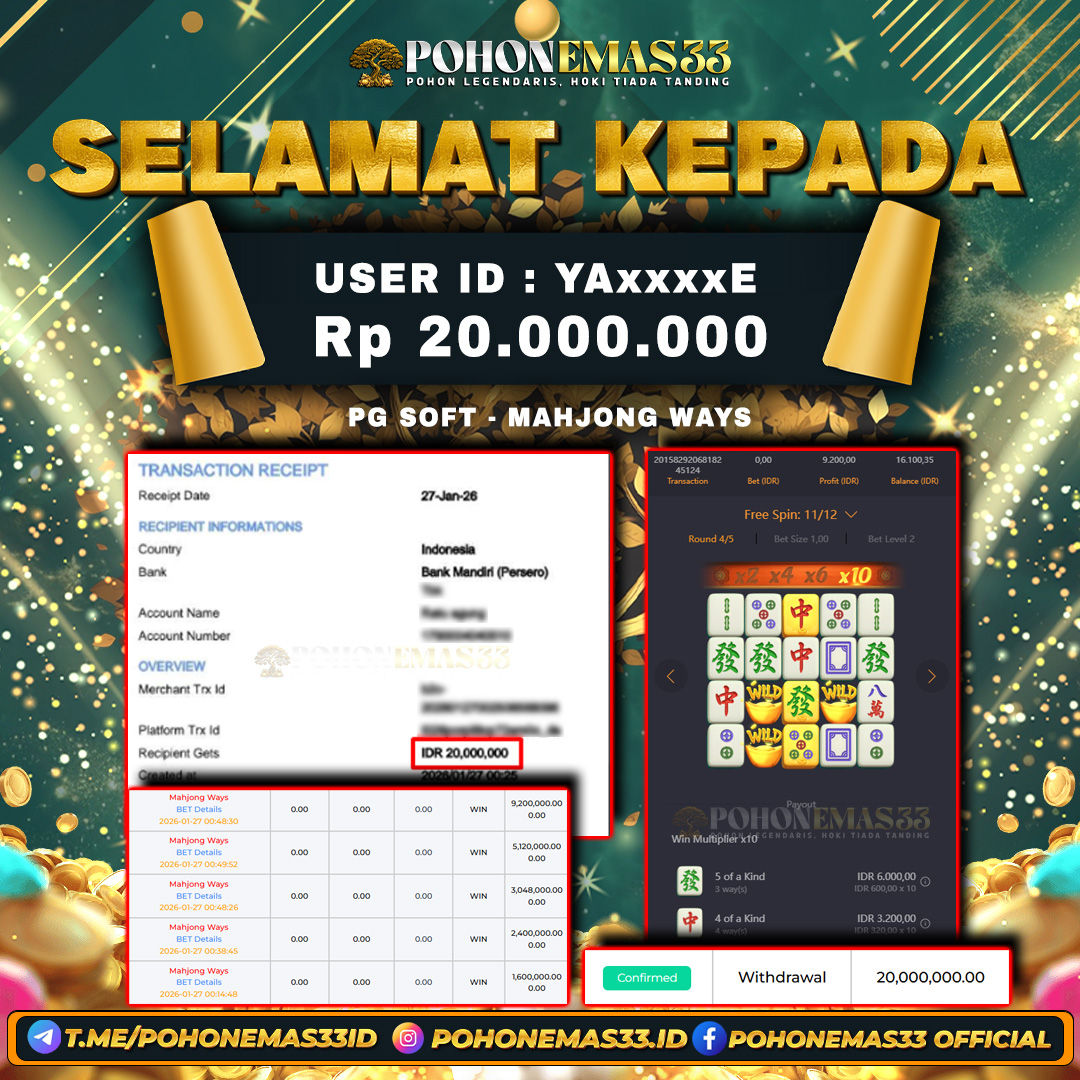 SELAMAT!! Kepada Member setia POHONEMAS33 telah berhasil menang besar di SLOT PGSOFT MAHJONG WAYS dengan USER ID : YAxxxxE