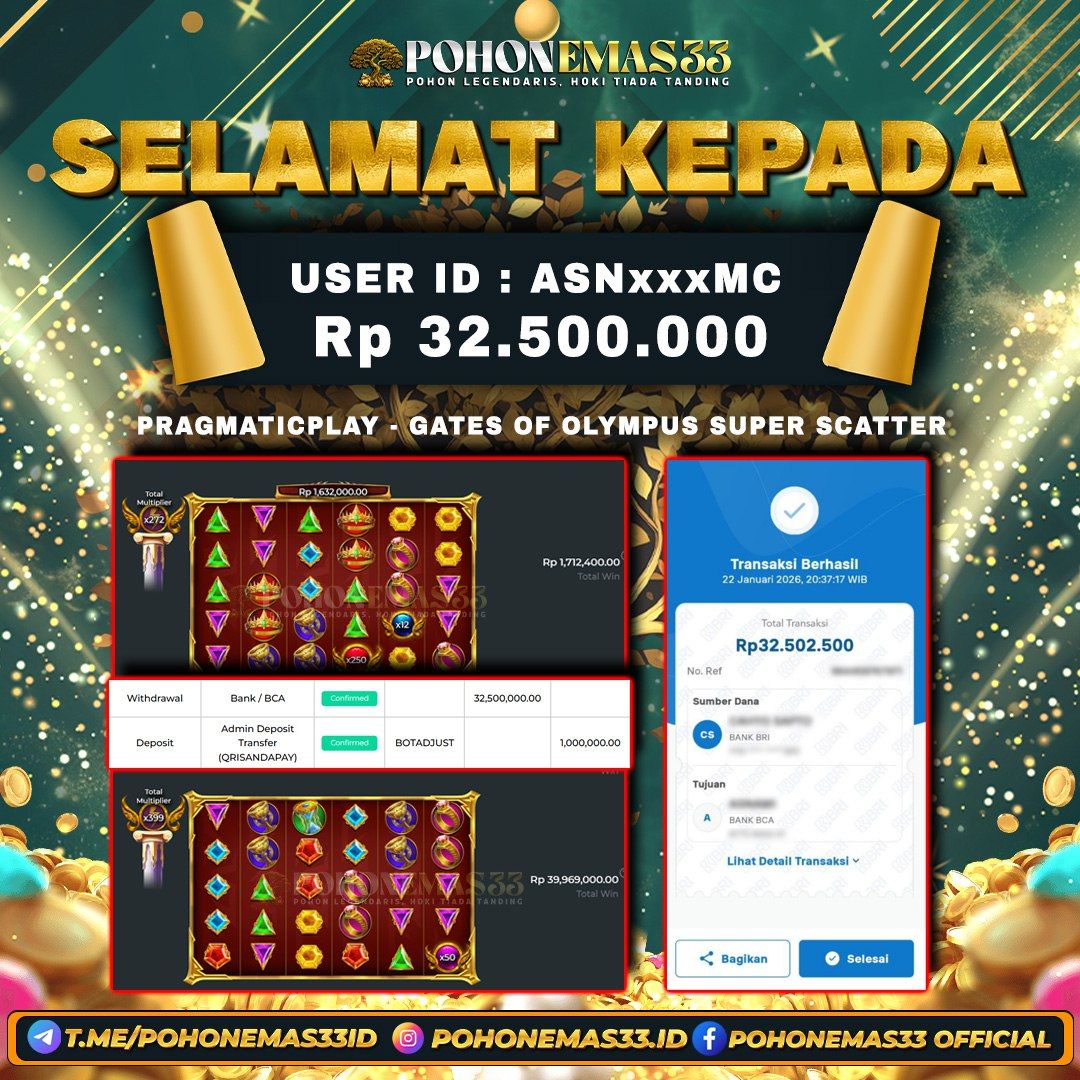 SELAMAT!! Kepada Member setia POHONEMAS33 telah berhasil menang besar di SLOT PRAGMATIC PLAY GATES OF OLYMPUS SUPER SCATTER dengan USER ID : ASNxxxMC