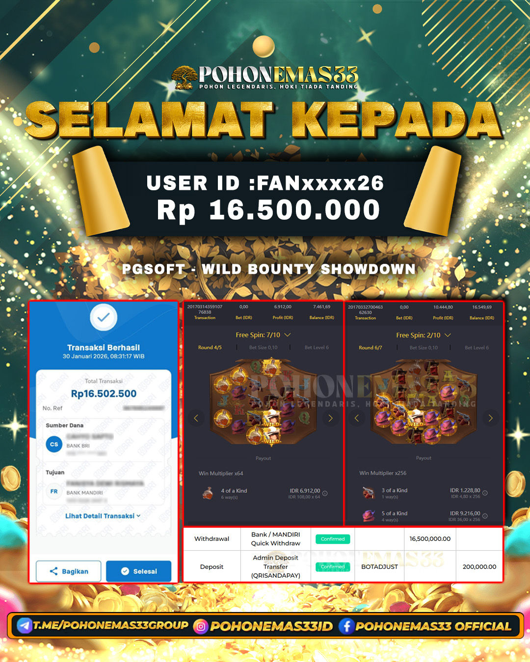 SELAMAT!! Kepada Member setia POHONEMAS33 telah berhasil menang besar di SLOT PGSOFT WILD BOUNTY SHOWDOWN dengan USER ID : FANxxxx26