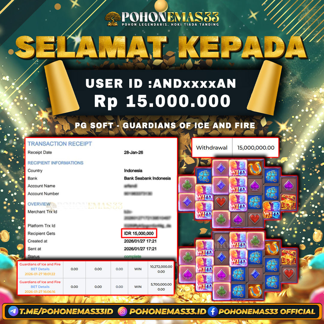 SELAMAT!! Kepada Member setia POHONEMAS33 telah berhasil menang besar di SLOT PGSOFT GUARDIANS OF ICE AND FIRE dengan USER ID : ANDxxxxAN