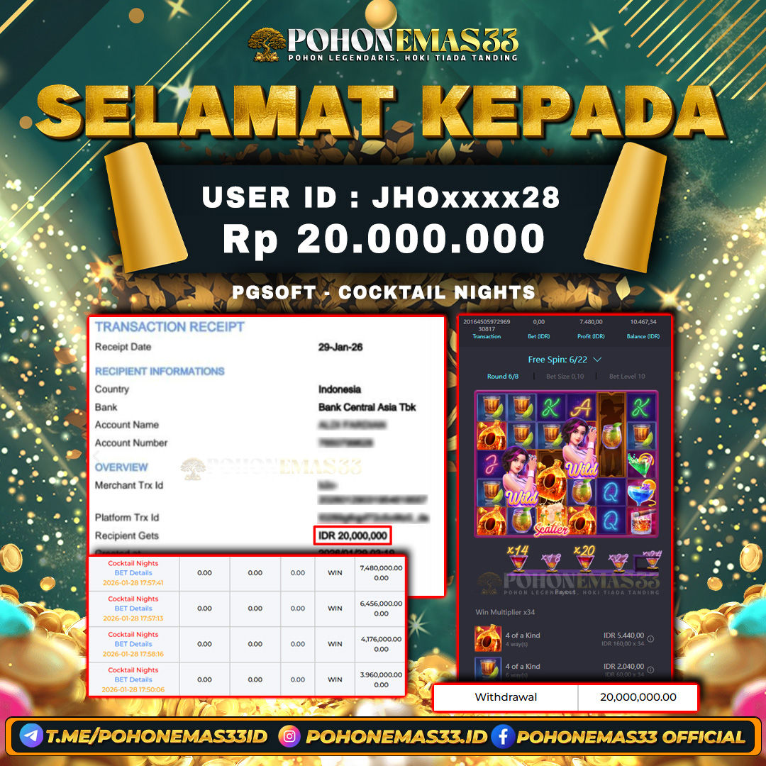 SELAMAT!! Kepada Member setia POHONEMAS33 telah berhasil menang besar di SLOT PGSOFT COCKTAIL NIGHTS dengan USER ID : JHOxxxx28
