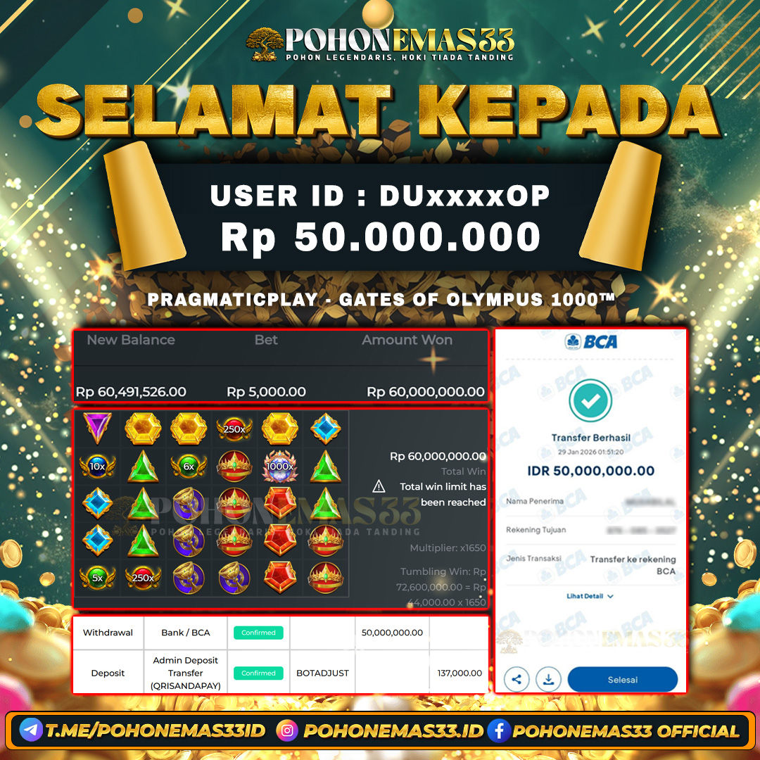 SELAMAT!! Kepada Member setia POHONEMAS33 telah berhasil menang besar di SLOT PRAGMATIC PLAY GATES OF OLYMPUS 1000™ dengan USER ID : DUxxxxOP