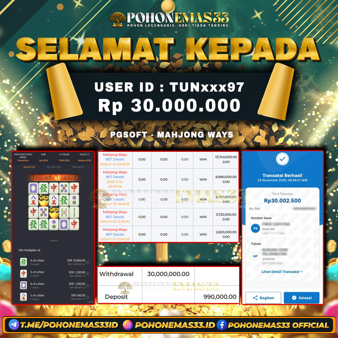 SELAMAT!! Kepada Member setia POHONEMAS33 telah berhasil menang besar di SLOT PGSOFT MAHJONG WAYS dengan USER ID : TUNxxx97