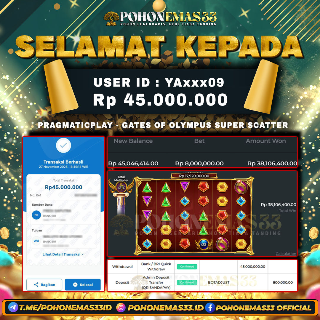 SELAMAT!! Kepada Member setia POHONEMAS33 telah berhasil menang besar di SLOT PRAGMATIC PLAY GATES OF OLYMPUS SUPER SCATTER dengan USER ID : YAxxx09