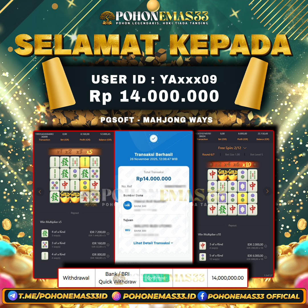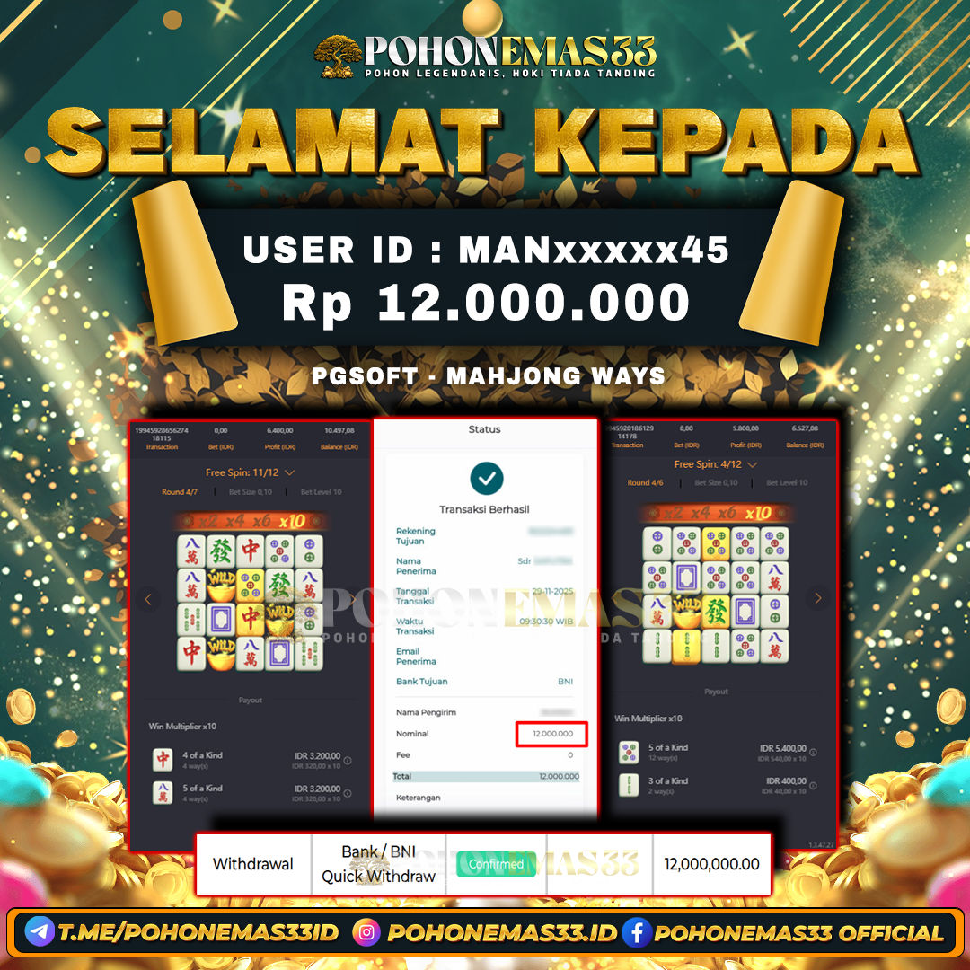 SELAMAT!! Kepada Member setia POHONEMAS33 telah berhasil menang besar di SLOT PGSOFT MAHJONG WAYS dengan USER ID : MANxxxxx45