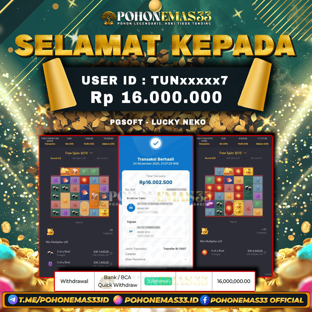 SELAMAT!! Kepada Member setia POHONEMAS33 telah berhasil menang besar di SLOT PGSOFT LUCKY NEKO dengan USER ID : TUNxxxxx7