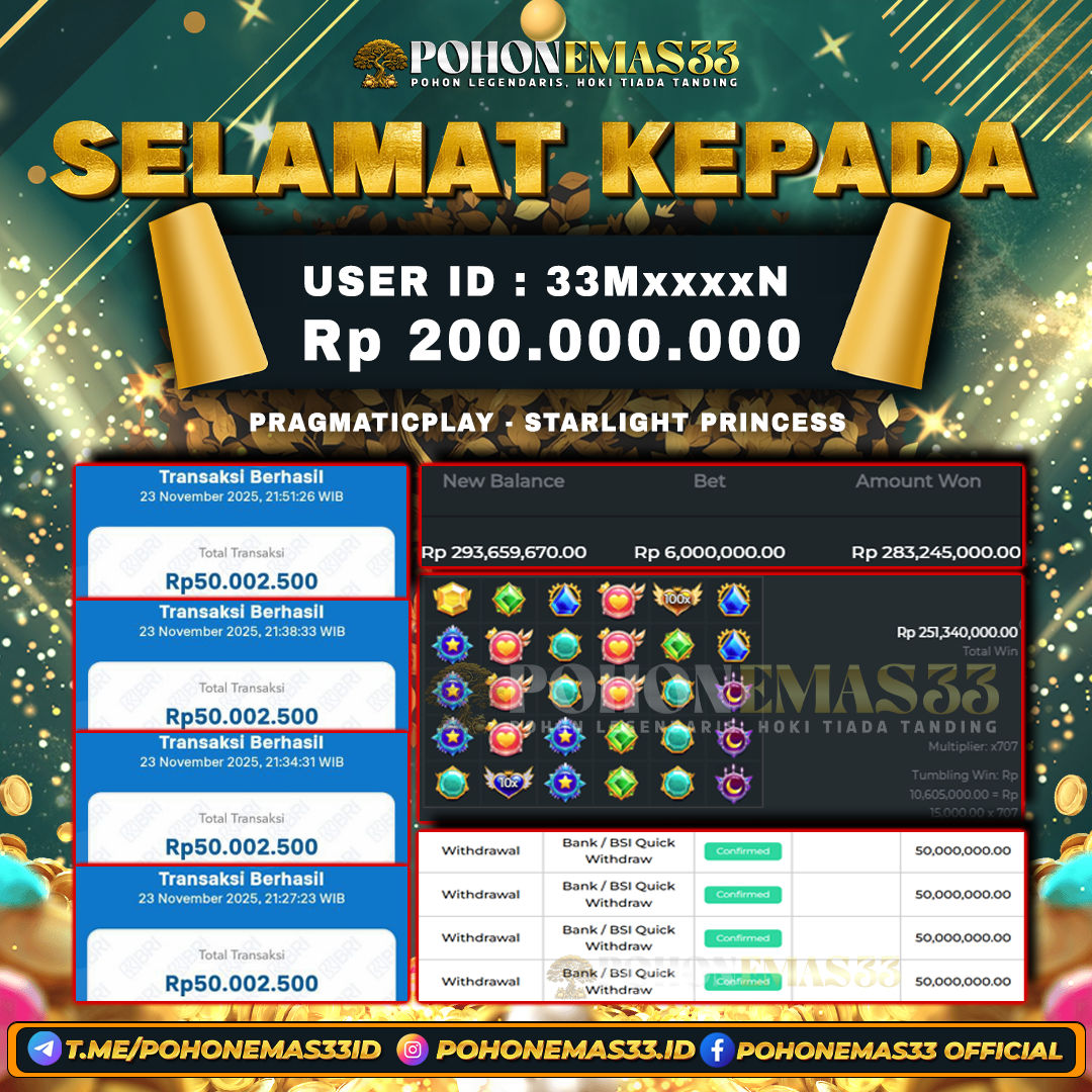 SELAMAT!! Kepada Member setia POHONEMAS33 telah berhasil menang besar di SLOT PRAGMATIC PLAY STARLIGHT PRINCESS dengan USER ID : 33MxxxxN