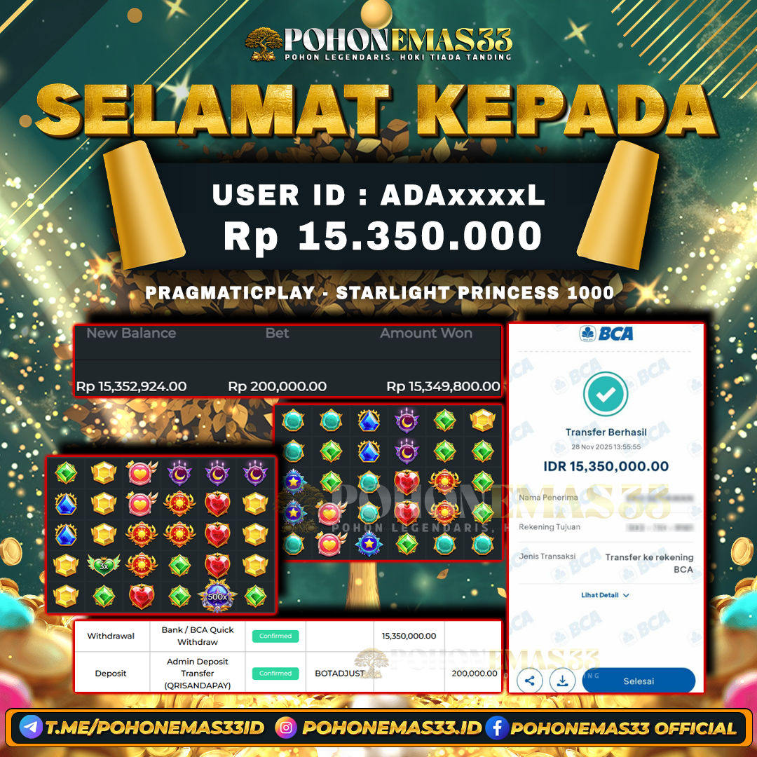 SELAMAT!! Kepada Member setia POHONEMAS33 telah berhasil menang besar di SLOT PRAGMATIC PLAY STARLIGHT PRINCESS 1000 dengan USER ID : ADAxxxxL