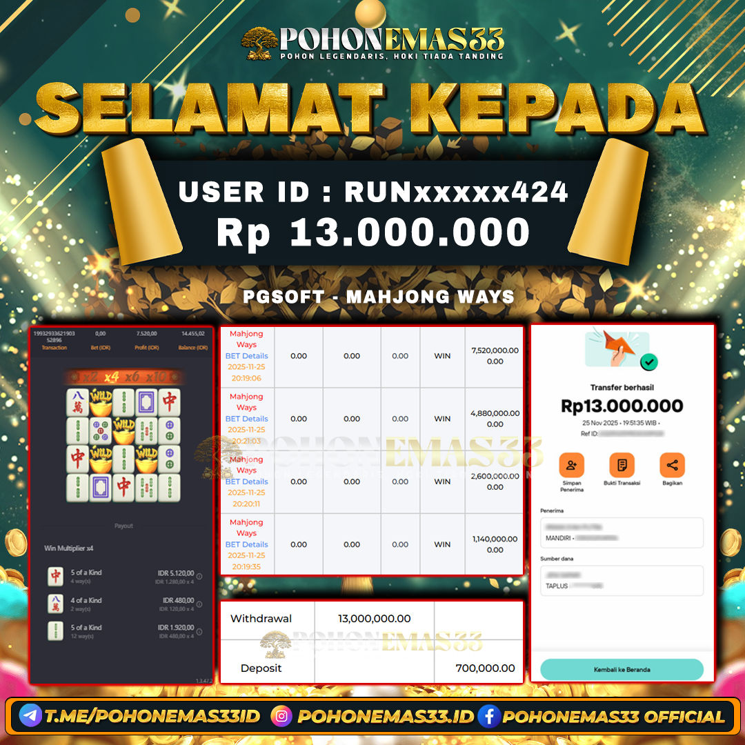 SELAMAT!! Kepada Member setia POHONEMAS33 telah berhasil menang besar di SLOT PGSOFT MAHJONG WAYS dengan USER ID : RUNxxxxx424