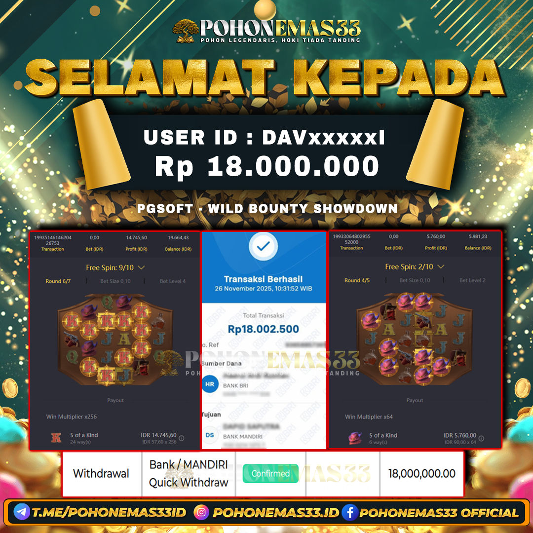 SELAMAT!! Kepada Member setia POHONEMAS33 telah berhasil menang besar di SLOT PGSOFT WILD BOUNTY SHOWDOWN dengan USER ID : DAVxxxxxI