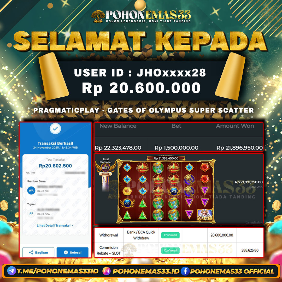 SELAMAT!! Kepada Member setia POHONEMAS33 telah berhasil menang besar di SLOT PRAGMATIC PLAY GATES OF OLYMPUS SUPER SCATTER dengan USER ID : JHOxxxx28