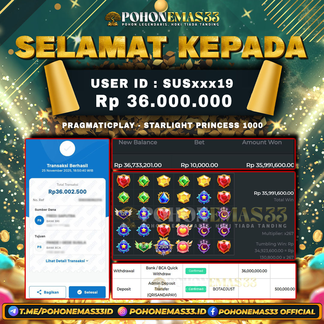 SELAMAT!! Kepada Member setia POHONEMAS33 telah berhasil menang besar di SLOT PRAGMATIC PLAY STARLIGHT PRINCESS 1000 dengan USER ID : SUSxxx19