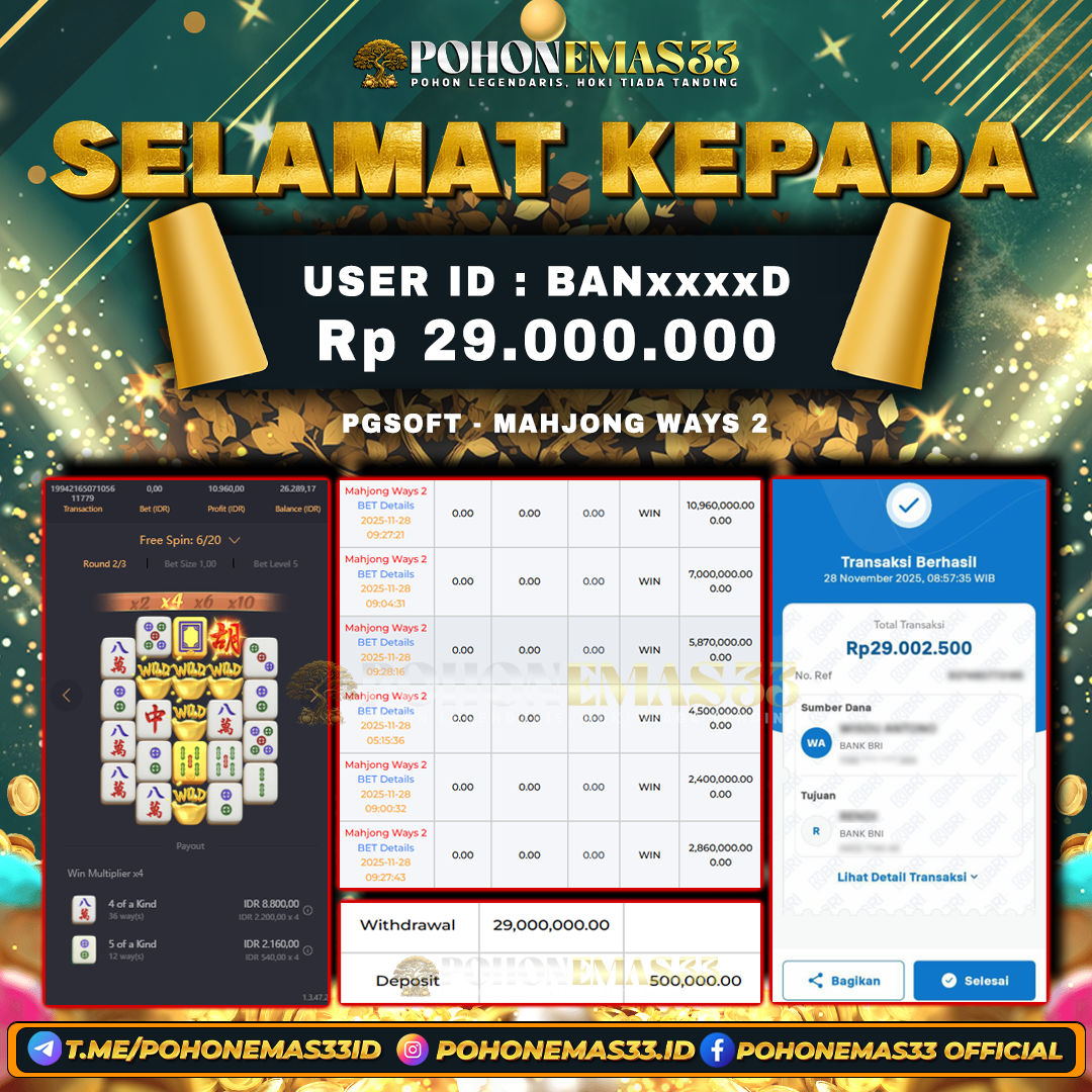 SELAMAT!! Kepada Member setia POHONEMAS33 telah berhasil menang besar di SLOT PGSOFT MAHJONG WAYS 2 dengan USER ID : BANxxxxD