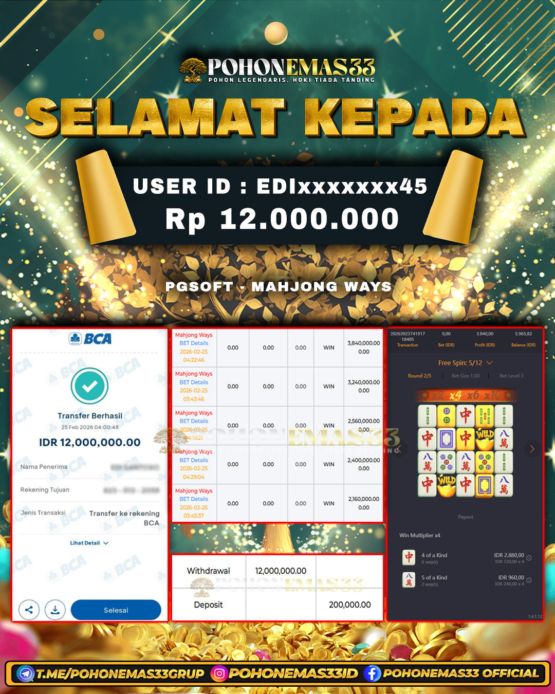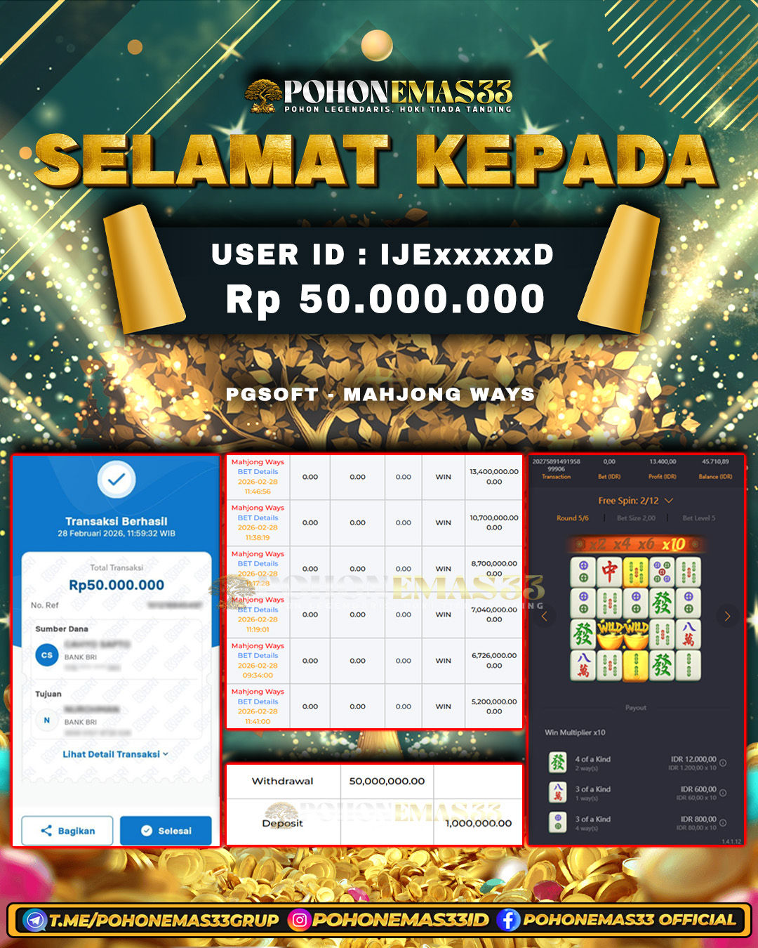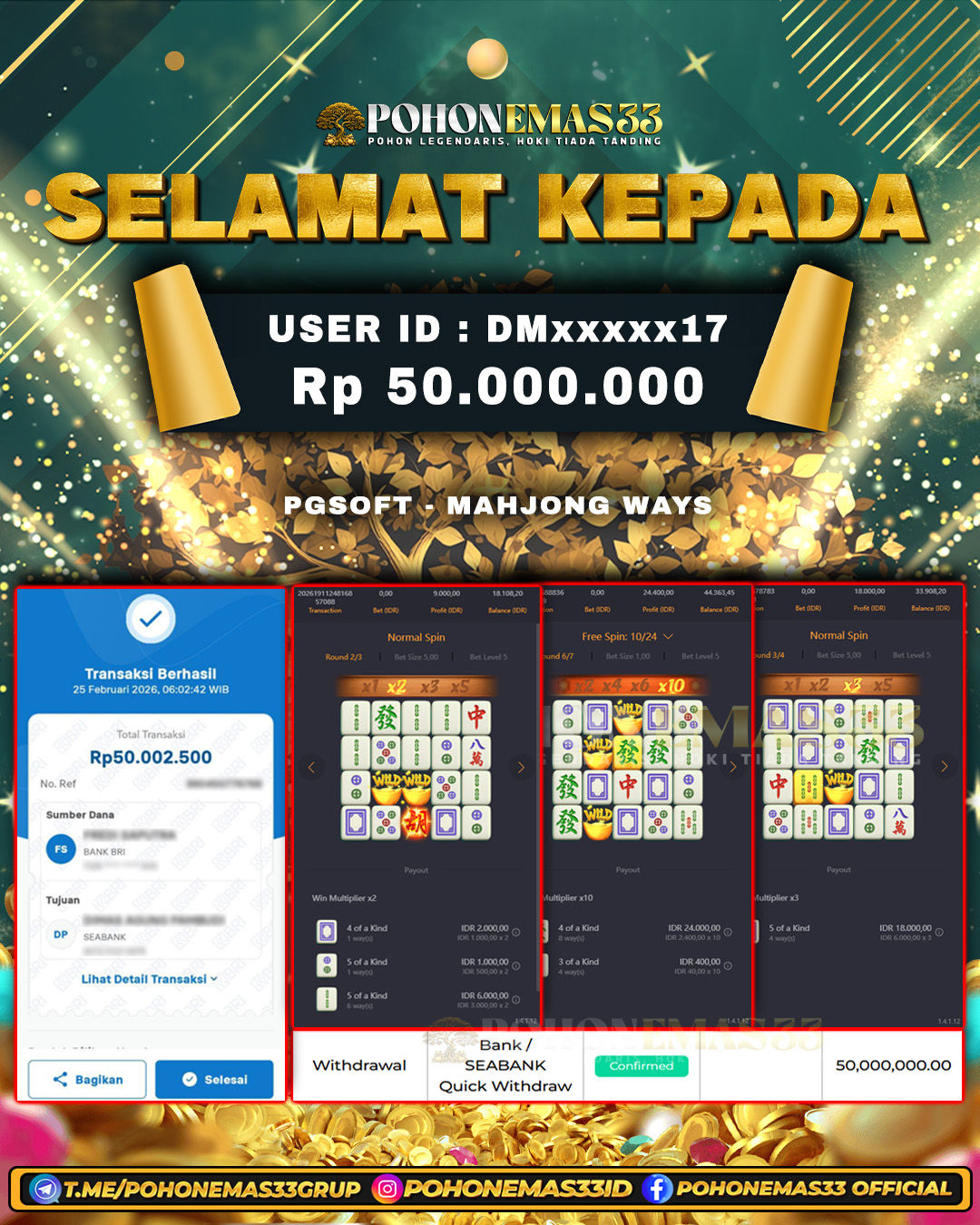 SELAMAT!! Kepada Member setia POHONEMAS33 telah berhasil menang besar di SLOT PGSOFT MAHJONG WAYS 2 dengan USER ID : ANxxxxIR