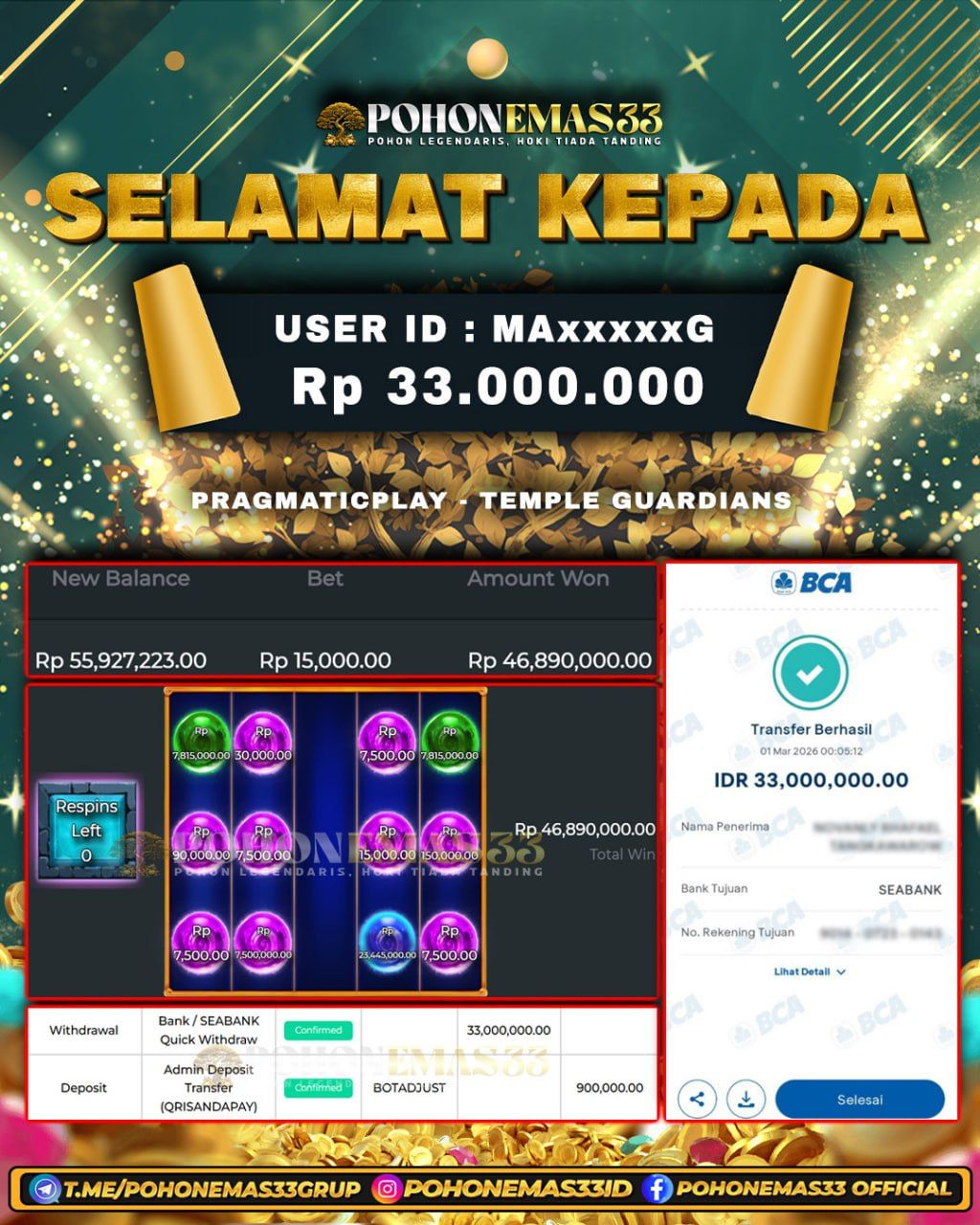 SELAMAT!! Kepada Member setia POHONEMAS33 telah berhasil menang besar di SLOT PRAGMATIC PLAY - TEMPLE GUARDIAN dengan USER ID : MAxxxxxG