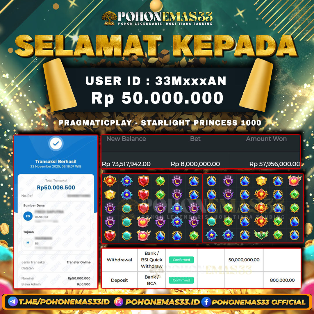 SELAMAT!! Kepada Member setia POHONEMAS33 telah berhasil menang besar di SLOT PRAGMATIC PLAY STARLIGHT PRINCESS 1000 dengan USER ID : 33MxxxAN