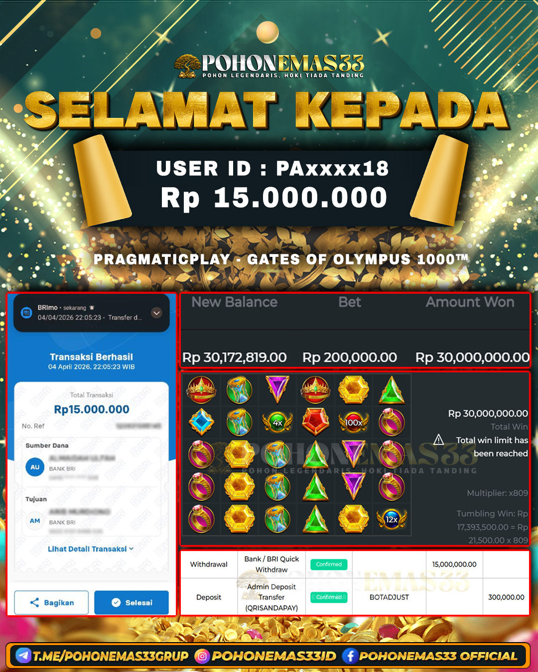 SELAMAT!! Kepada Member setia POHONEMAS33 telah berhasil menang besar di SLOT PRAGMATIC PLAY GATES OF OLYMPUS 1000™ dengan USER ID : PAxxxx18