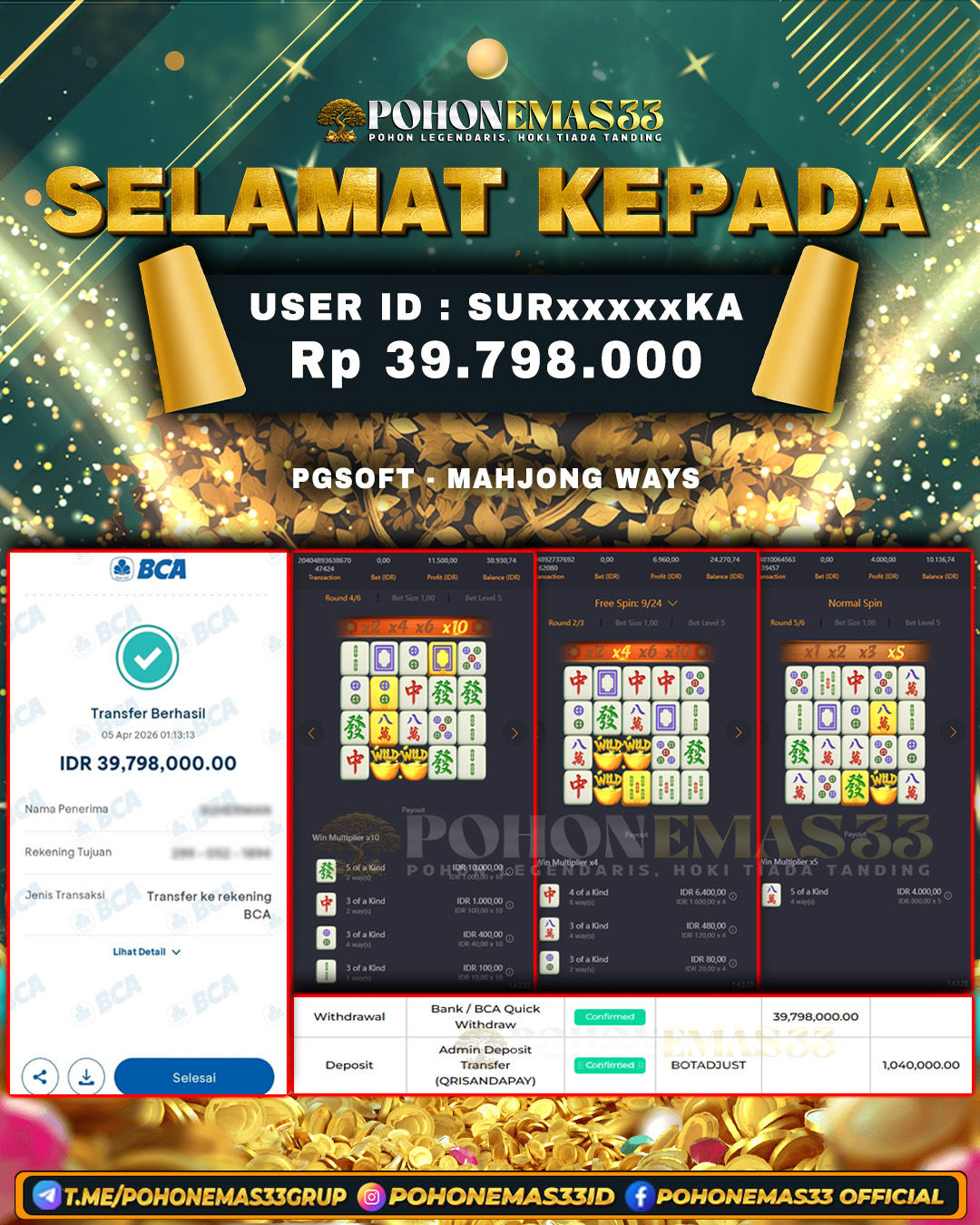 SELAMAT!! Kepada Member setia POHONEMAS33 telah berhasil menang besar di SLOT PGSOFT MAHJONG WAYS dengan USER ID : SURxxxxxKA