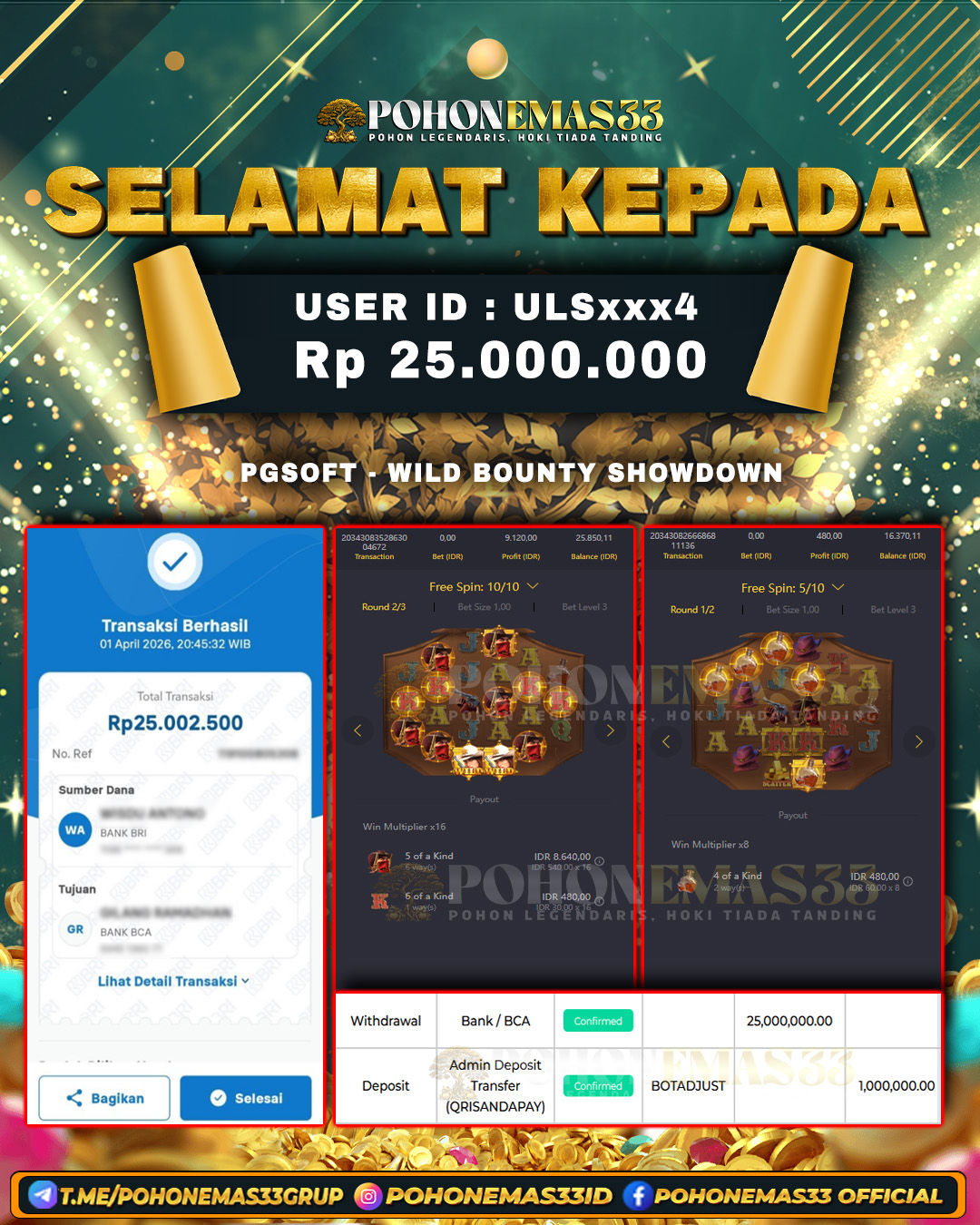 SELAMAT!! Kepada Member setia POHONEMAS33 telah berhasil menang besar di SLOT PGSOFT WILD BOUNTY SHOWDOWN dengan USER ID : ULSxxx4