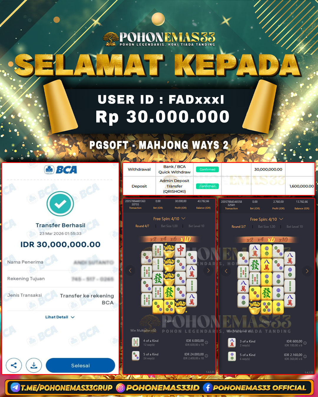 SELAMAT!! Kepada Member setia POHONEMAS33 telah berhasil menang besar di SLOT PGSOFT MAHJONG WAYS 2 dengan USER ID : FADxxxI
