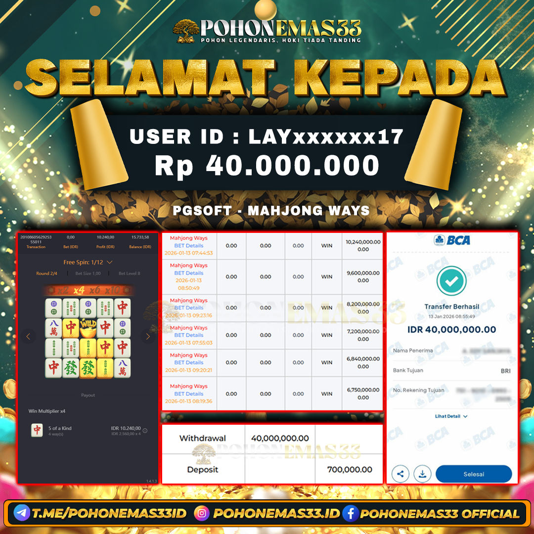SELAMAT!! Kepada Member setia POHONEMAS33 telah berhasil menang besar di SLOT PGSOFT MAHJONG WAYS dengan USER ID : LAYxxxxxx17