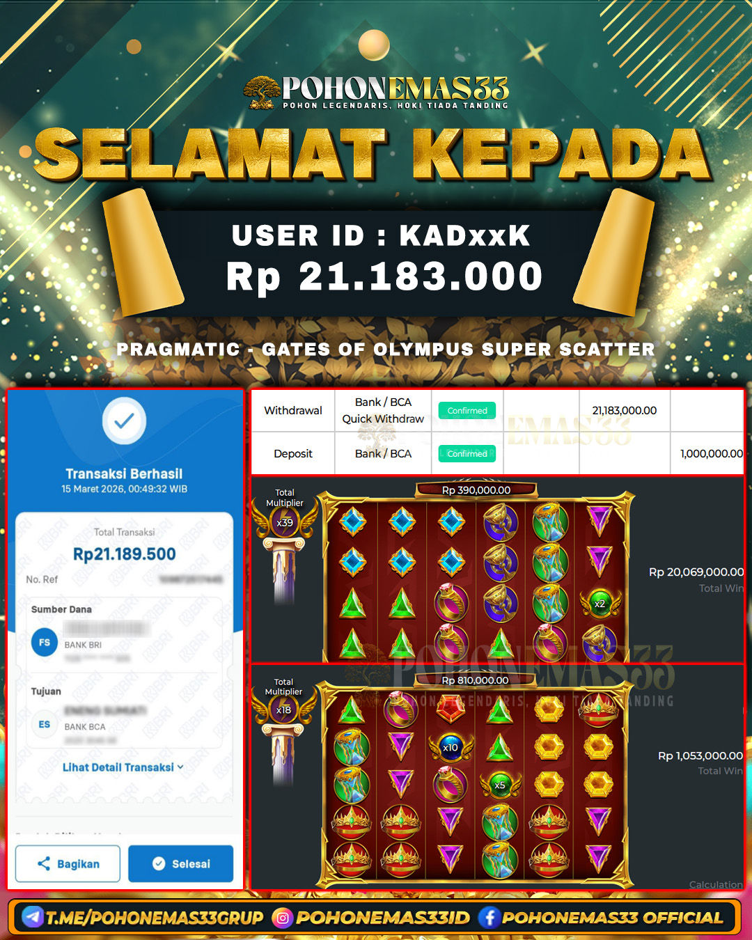 SELAMAT!! Kepada Member setia POHONEMAS33 telah berhasil menang besar di SLOT PRAGMATIC PLAY GATES OF OLYMPUS SUPER SCATTER dengan USER ID : KADxxK
